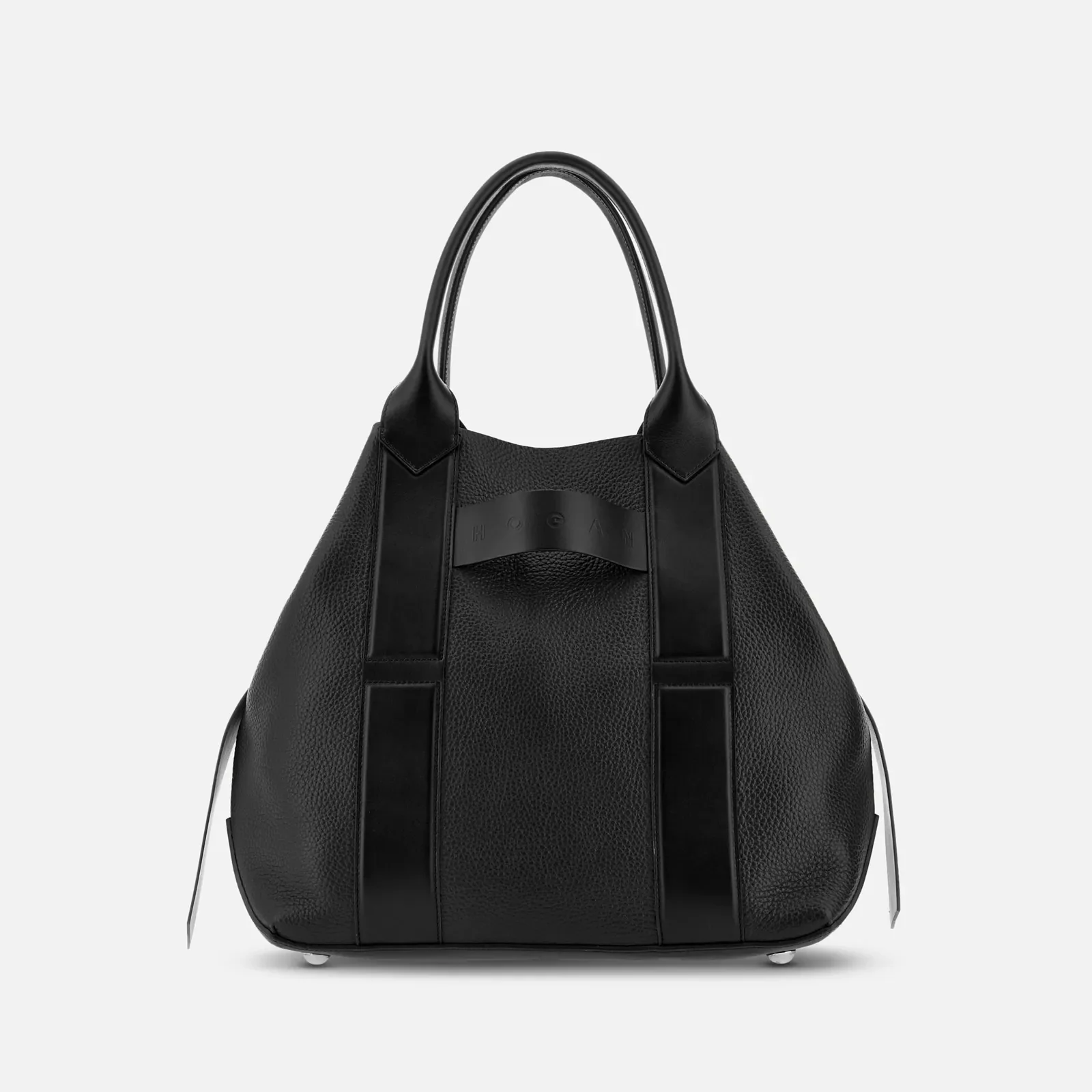 - Women's shopping bag - Item crafted in hammered leather - Smooth leather inserts - Front handle with stamped Hogan logo - Dimensions: 40 x 32 x 16 cm - Fixed handles - Address holder tag - Adjustable compartment with strap and branded buckle - Via Monte Napoleone address logo stamped on the left strap - Hogan logo stamped on the left strap - Removable zipped pouch - Metal feet - Maintenance and care cards included - Fabric dustbag included This shopper classic revisited is a reinterpretation of the signature Hogan Script design. Exaggerated ‘H’ details, and a lightweight mix of smooth and unlined, ultra-soft grainy folding leather. The front handle with stamped Hogan logo is designed to fit your hand, for additional holding versatility. It comes with a removable internal pouch.