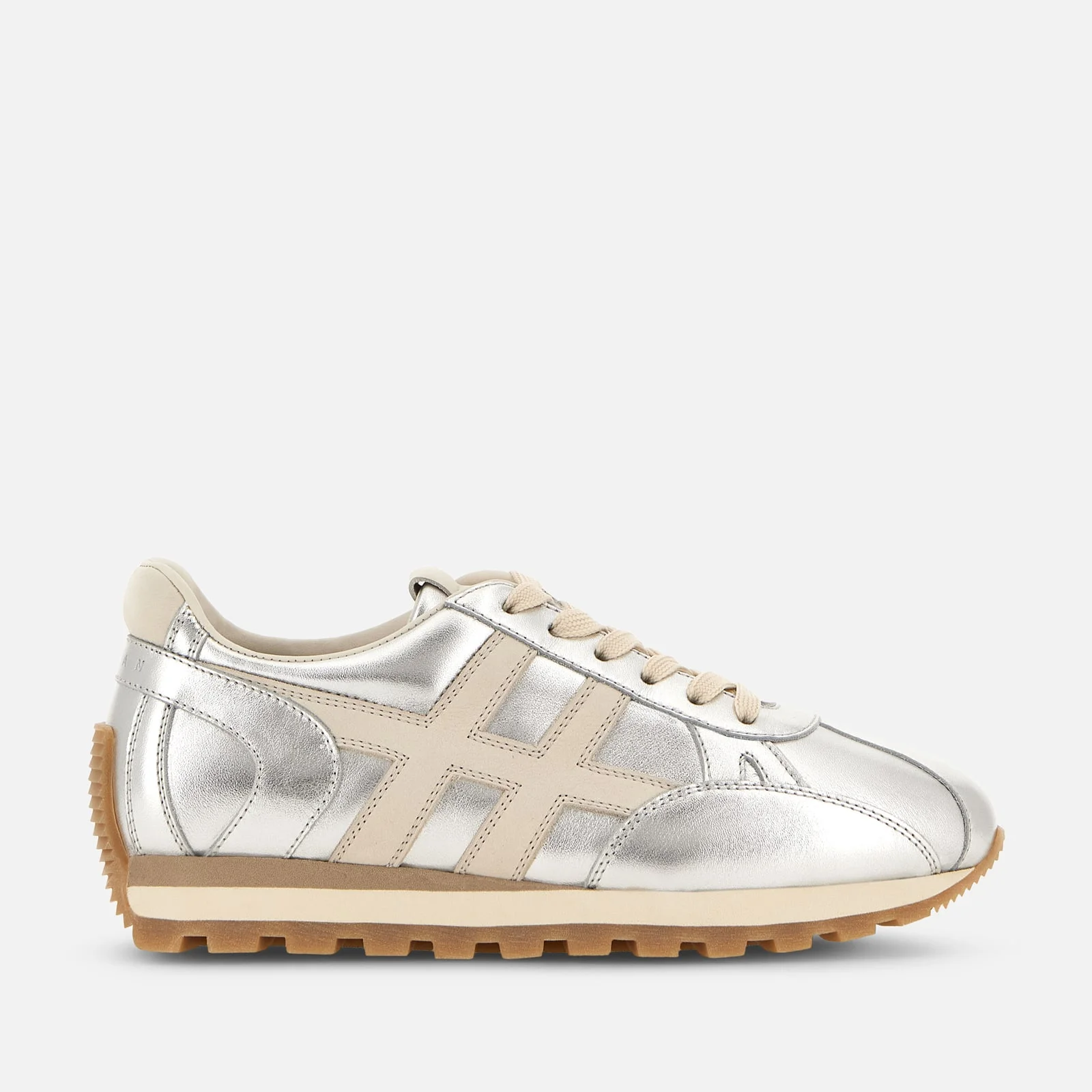 - Women's Hogan 86er Sneakers - Made in Italy - Metallic leather upper - Nubuck H applied on the side - Smooth leather detailing - Memory foam insole 0.2 ins - EVA outsole - Total height 1.6 ins - Maintenance and care cards included - Fabric dustbag included - Additional laces included A nod to the popular sneakers that helped define the year of the brand’s birth, the Hogan 86er come here with the iconic H applique detailing. The extralight outsole features a cleated tread that also designs the heel reinforcement. Complemented by a memory foam insole, these sneakers in metallic leather are perfect for an easy-going and relaxed outfit.