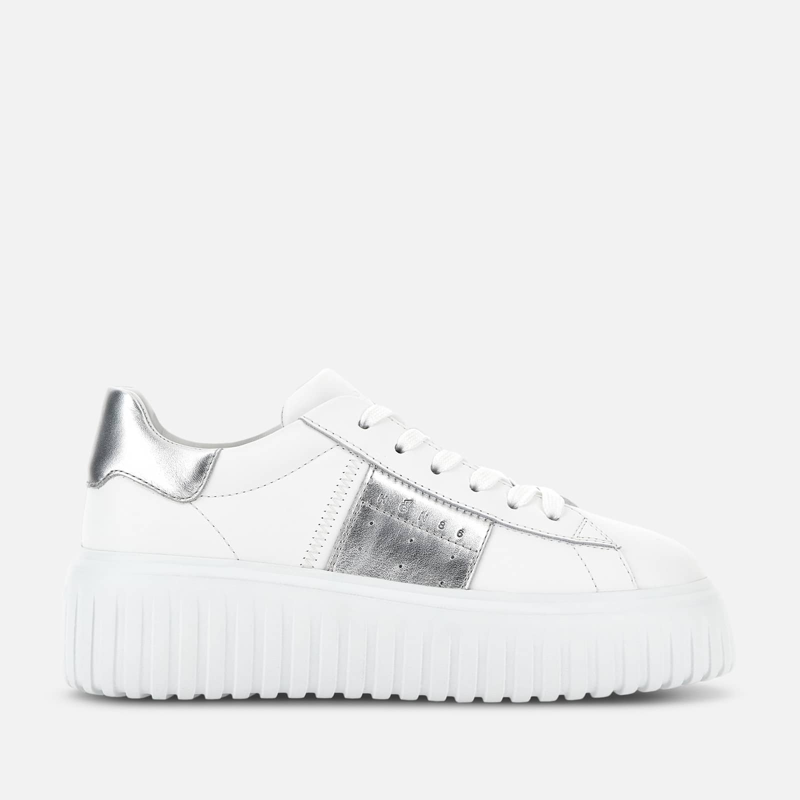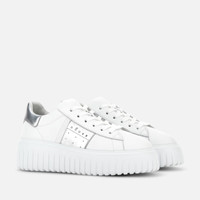 - Women's Hogan H-Stripes Sneakers - Made in Italy - Smooth leather upper - Metallic leather inserts - HGN86 logo printed on the side - Memory foam insole 0.3 ins - EVA outsole - Total height 2.3 ins - Maintenance and care cards included - Fabric dustbag included - Additional laces included A new style with sporty and versatile lines, the H-Stripes sneakers feature an extralight outsole with vertical stripes. The upper, with a compact and balanced design, is characterized by the HGN86 logo printed on the side band. The upper trim comes with a soft padding. This version is crafted in smooth and metallic leather, with a memory foam insole that guarantees comfortable cushioning.