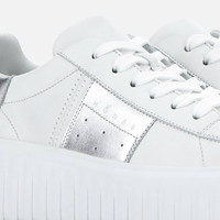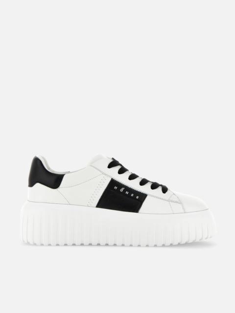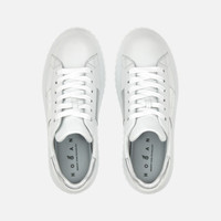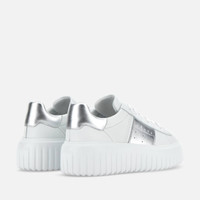 - Women's Hogan H-Stripes Sneakers - Made in Italy - Nappa leather upper - Metallic leather side band - Memory foam insole 0.3 ins - EVA outsole - Total height 2.3 ins - Maintenance and care cards included - Fabric dustbag included - Additional laces included A new style with sporty and versatile lines, the H-Stripes sneakers feature an extralight outsole with vertical stripes. The upper, with a compact and balanced design, is characterized by a side band with logo in metallic leather. The upper trim, featuring stitching on the back patch, comes with a soft padding. This version is crafted in soft nappa leather, with a memory foam insole that guarantees comfortable cushioning.
