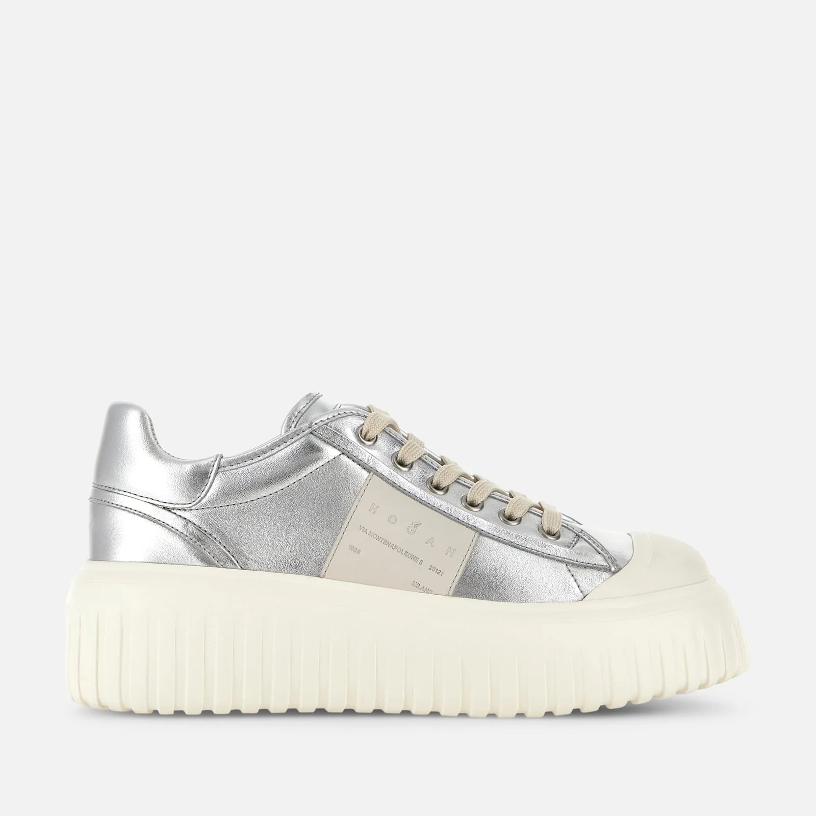 - Women's Hogan H-Stripes Sneakers - Made in Italy - Metallic leather upper - Address logo stamped on the side - Hogan logo stamped on the tongue - Memory foam insole 0.3 ins - EVA outsole - Total height 2.3 ins - Maintenance and care cards included - Fabric dustbag included - Additional laces included Style with sporty and versatile lines, the H-Stripes sneakers feature an extralight outsole with vertical stripes. This version in metallic leather features the address logo on the side and a rubber toe that recalls vintage sneakers. The memory foam insole guarantees a comfortable and cushioned fit.