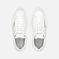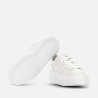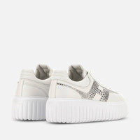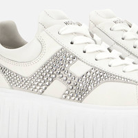 - Women's Hogan H-Striped Sneakers - Made in Italy - Nappa leather upper - Suede and rhinestone side H - Memory foam insole 0.3 ins - EVA outsole - Total height 2.3 ins - Maintenance and care cards included - Fabric dustbag included - Additional laces included A style with sporty and versatile lines, the H-Stripes sneakers feature an extralight outsole with vertical stripes. The upper, with a compact and balanced design, is characterized by a suede and rhinestone H that extends across the side. The upper trim, with stitching on the back patch, features a soft padding. This version is crafted in nappa leather, with a memory foam insole that guarantees comfortable cushioning.