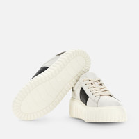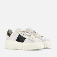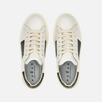 - Women's Hogan H-Stripes Sneakers - Made in Italy - Nappa leather upper - Metallic leather side band - Memory foam insole 0.3 ins - EVA outsole - Total height 2.3 ins - Maintenance and care cards included - Fabric dustbag included - Additional laces included A new style with sporty and versatile lines, the H-Stripes sneakers feature an extralight outsole with vertical stripes. The upper, with a compact and balanced design, is characterized by a side band with logo in metallic leather. The upper trim in reptile-print leather, featuring stitching on the back patch, comes with a soft padding. This version is crafted in soft nappa leather, with a memory foam insole that guarantees comfortable cushioning.