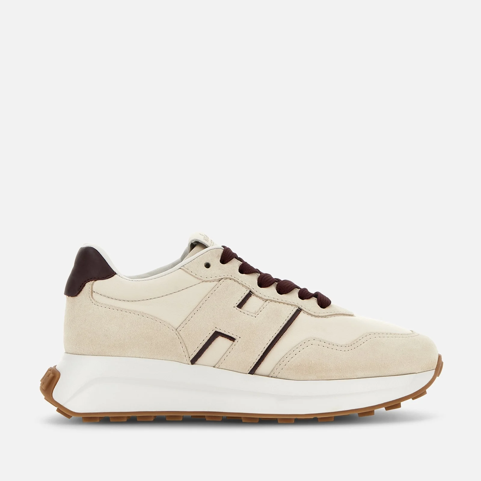 - Women's Hogan H641 Sneakers - Made in Italy - Suede upper - Nappa leather inserts - Side H - Smooth leather detailing - Memory foam insole 0.3 ins - Rubber outsole - Total height 2 ins - Maintenance and care cards included - Fabric dustbag included - Additional laces included Bold look and retro references coexist in the Hogan H641 sneakers. Designed for optimal grip, the lightweight outsole comes with a tread with H-shaped spikes. These sneakers feature a suede upper, with soft nappa leather inserts, and side H. The memory foam insole guarantees a cushioned fit.