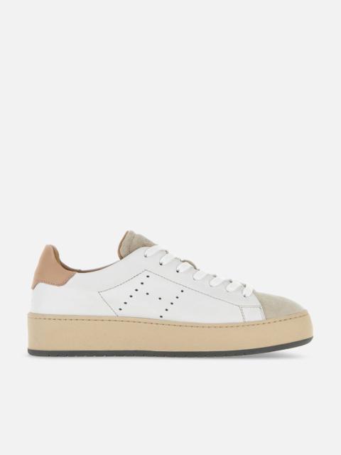 - Women's Hogan H672 Sneakers - Smooth leather upper - Suede inserts - Perforated side H - Soft leather covered insole 0.2 ins - Rubber outsole - Total height 1.3 ins - Maintenance and care cards included - Fabric dustbag included - Additional laces included Inspired by 80s tennis shoes, the Hogan H672 are defined by their refined yet laid-back vintage look. Finished with a handcrafted wash treatment, that enhances their softness and relaxed style, these sneakers are characterized by a perforated side H and an essential line outsole. Complemented by a soft insole, they come here in smooth leather and suede.