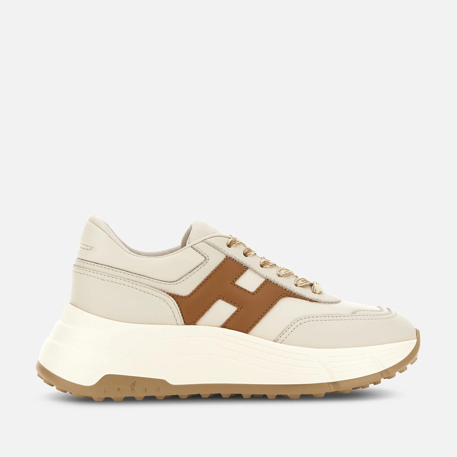 - Women's Hogan Hi-Fi Sneakers - Made in Italy - Nappa leather upper - Side H - Smooth leather detailing - Memory foam insole 0.3 ins - Rubber outsole - Total height 2.6 ins - Maintenance and care cards included - Fabric dustbag included - Additional laces included The Hogan Hi-Fi sneakers take a feminine twist on the studded Hyperlight outsole, with a raised platform for height and elegance. Recalling the 80s sporting iconography with their technical finishing and urban vocation, they feature a combination of soft and snappy lines. The upper comes here crafted in soft nappa leather, with a maxi side H. An energetic athleisure style, with a memory foam insole to guarantee extra comfort and a cushioned fit.