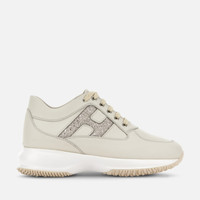 - Women's Hogan Interactive Sneakers - Made in Italy - Smooth leather upper - Glitter fabric side H - Removable insole 0.5 ins - Rubber outsole - Total height 2.2 ins - Maintenance and care cards included - Fabric dustbag included - Additional laces included Hogan Interactive is a timeless icon, since 1997 absolute interpreter of functional and contemporary luxury. Characterized by an elegant design and a lightweight outsole to guarantee a tall-and-slim look, these precious sneakers in smooth leather feature a glitter fabric side H. Perfect for a sporty chic look.