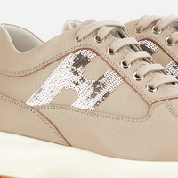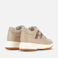 - Women's Hogan Interactive Sneakers - Made in Italy - Leather upper - Micro-sequin side H - Removable insole 0.5 ins - Rubber outsole - Total height 2.2 ins - Maintenance and care cards included - Fabric dustbag included - Additional laces included Hogan Interactive is a real timeless icon, characterized by an elegant design and a lightweight outsole to guarantee a tall-and-slim look. Since 1997 it gets renewed with each collection still representing an absolute functional and contemporary luxury icon. These sneakers in leather come with a micro-sequin side H. Perfect for a sporty chic look.