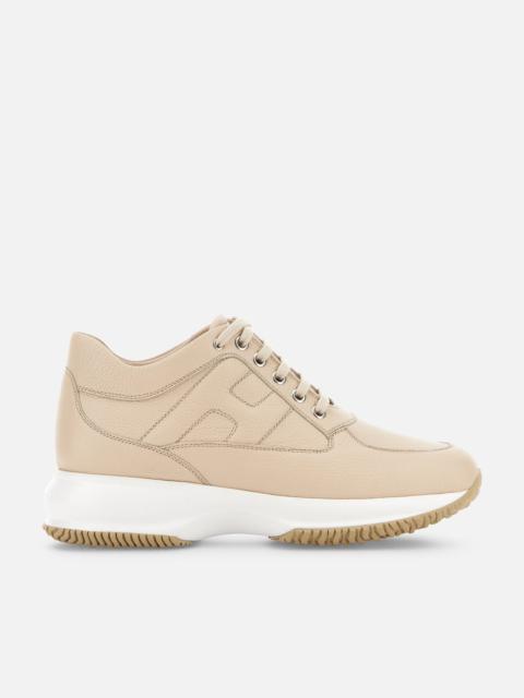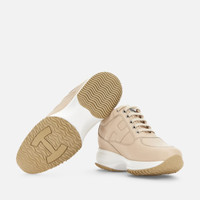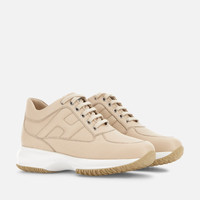- Women's Hogan Interactive Sneakers - Made in Italy - Nappa leather upper - Padded side H - Removable insole 0.5 ins - Rubber outsole - Total height 2.2 ins - Maintenance and care cards included - Fabric dustbag included - Additional laces included Hogan Interactive is a real timeless icon, characterized by an elegant design and a lightweight outsole to guarantee a tall-and-slim look. Since 1997 it gets renewed with each collection still representing an absolute functional and contemporary luxury icon. These sneakers in nappa leather come with a padded side H. Perfect for a sporty chic look.