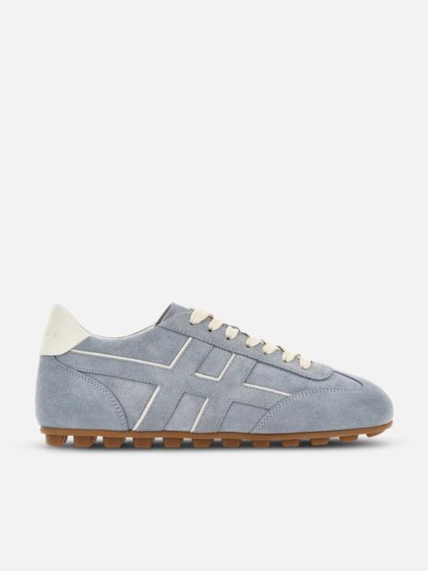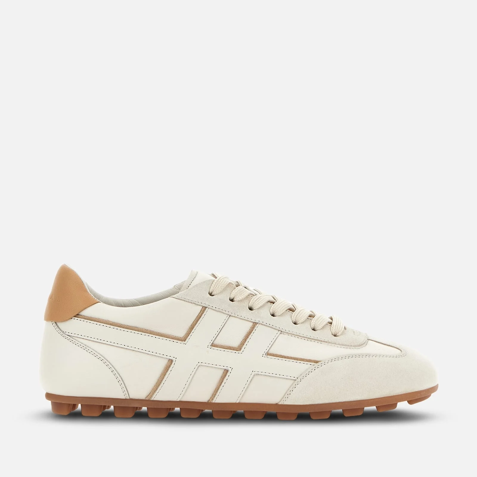 - Women's Hogan Olympia Sneakers - Made in Italy - Nappa leather upper - Suede inserts - Smooth leather side H - Logo stamped on the tongue and heel - Leather lining - Memory foam insole 0.4 ins - Rubber outsole - Total height 1.3 ins - Maintenance and care cards include - Fabric dustbag included - Additional laces included A slim, super-feminine sneaker juxtaposed with a sporty, football-inspired tread: the Hogan Olympia sneaker is a contemporary reworking of the signature brand classic, in a play of contrasts. Crafted in nappa leather and suede with side H, it is characterized by padded detailing and retro-inspired stitching. An elegant new women’s shoe construction, complemented by a soft memory foam insole.