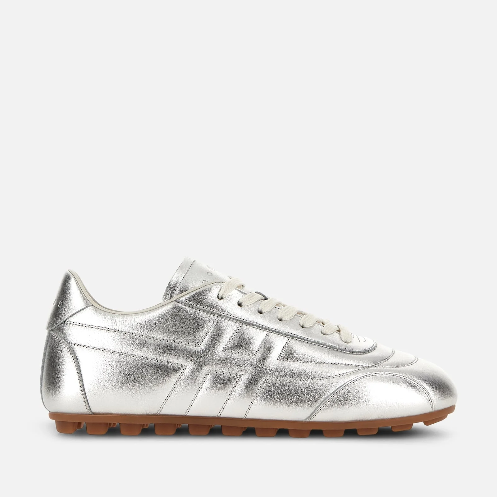 - Women's Hogan Olympia Sneakers - Made in Italy - Metallic leather upper - Side H - Logo stamped on the tongue and heel - Leather lining - Memory foam insole 0.4 ins - Rubber outsole - Total height 1.3 ins - Maintenance and care cards included - Fabric dustbag included A slim, super-feminine sneaker juxtaposed with a sporty, football-inspired tread: the Hogan Olympia sneaker is a contemporary reworking of the signature brand classic, in a play of contrasts. Crafted in metallic leather with side H, it is characterized by padded detailing and retro-inspired stitching. An elegant new women’s shoe construction, complemented by a soft memory foam insole.