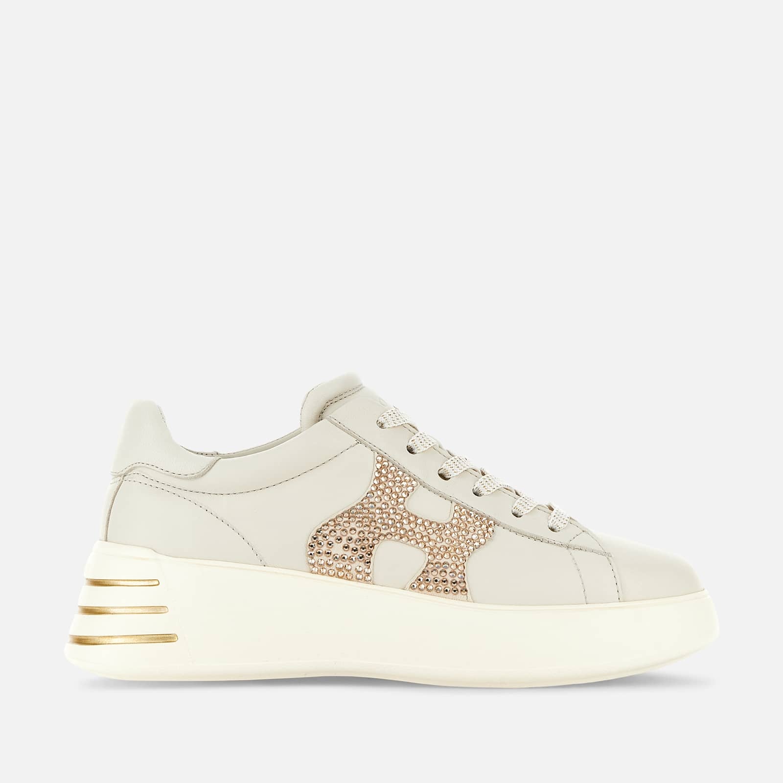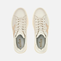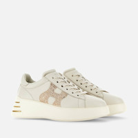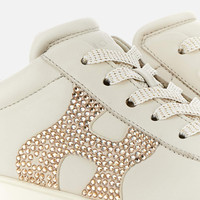 - Women's Hogan Interactive Sneakers - Made in Italy - Smooth leather upper - Leather side H with glitter print - Memory foam insole 0.2 ins - Rubber outsole - Total height 2 ins - Maintenance and care cards included - Fabric dustbag included - Additional laces included The Hogan Rebel sneakers are characterized by an extralight outsole with grooves on the back. With soft and refined lines, they come here in nappa leather, with a rhinestone covered side H. The memory foam insole guarantees a cushioned fit to this iconic and versatile style.