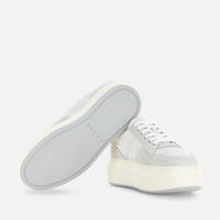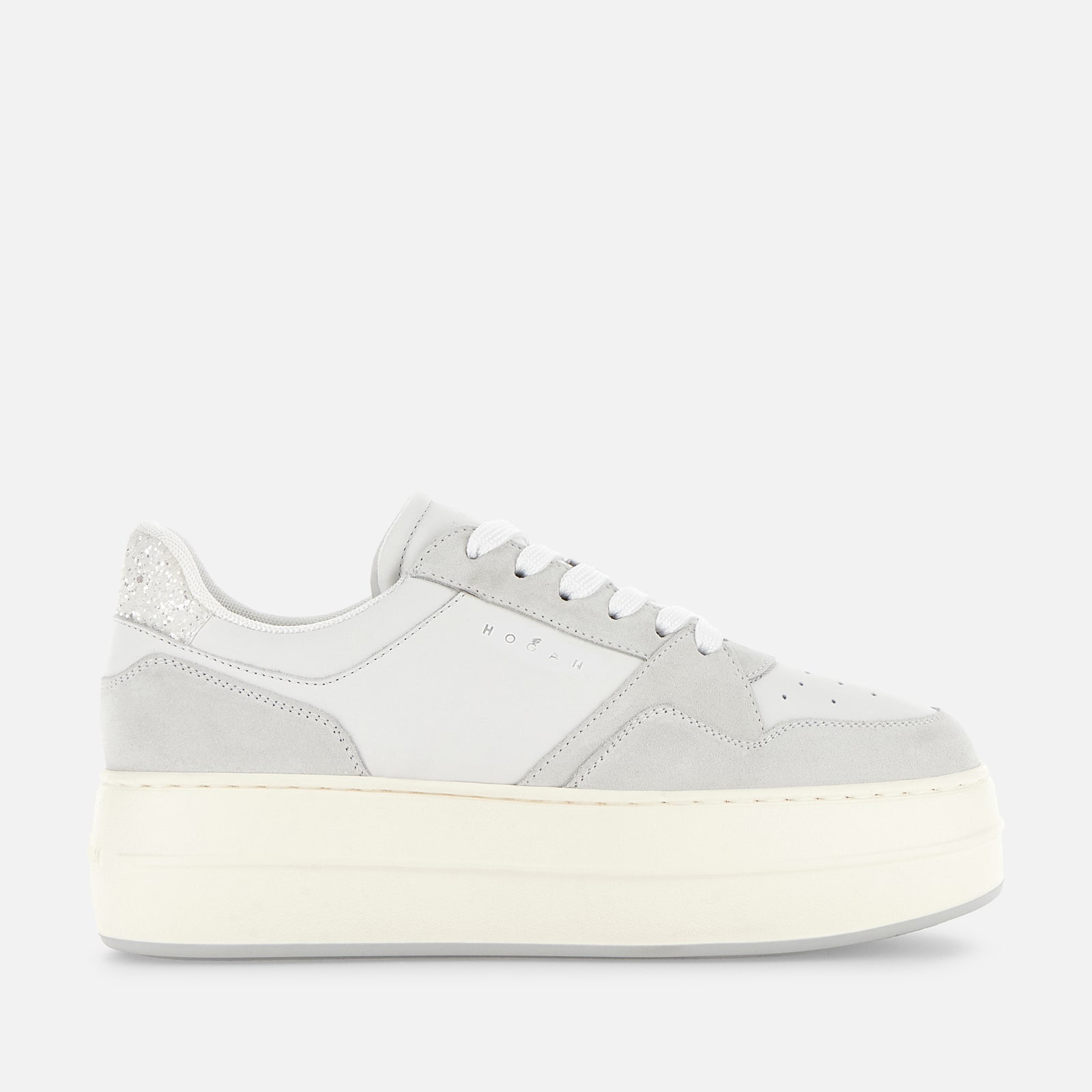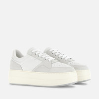 - Women's Hogan Skyscraper Sneakers - Made in Italy - Suede and smooth leather upper - Glitter fabric detailing - Hogan logo stamped on the side - Memory foam insole 0.2 ins - EVA outsole - Total height 2.6 ins - Maintenance and care cards included - Fabric dustbag included - Additional laces included A modernized and ultra-platformed version of the archetypal tennis shoe, the Hogan Skyscraper sneakers feature sleek lines and an urban chic vibe. Here with a basketball-inspired upper, they are crafted in suede and smooth leather, with the Hogan logo stamped on the side. Featuring a high lightweight outsole, they are complemented by a soft memory foam insole.