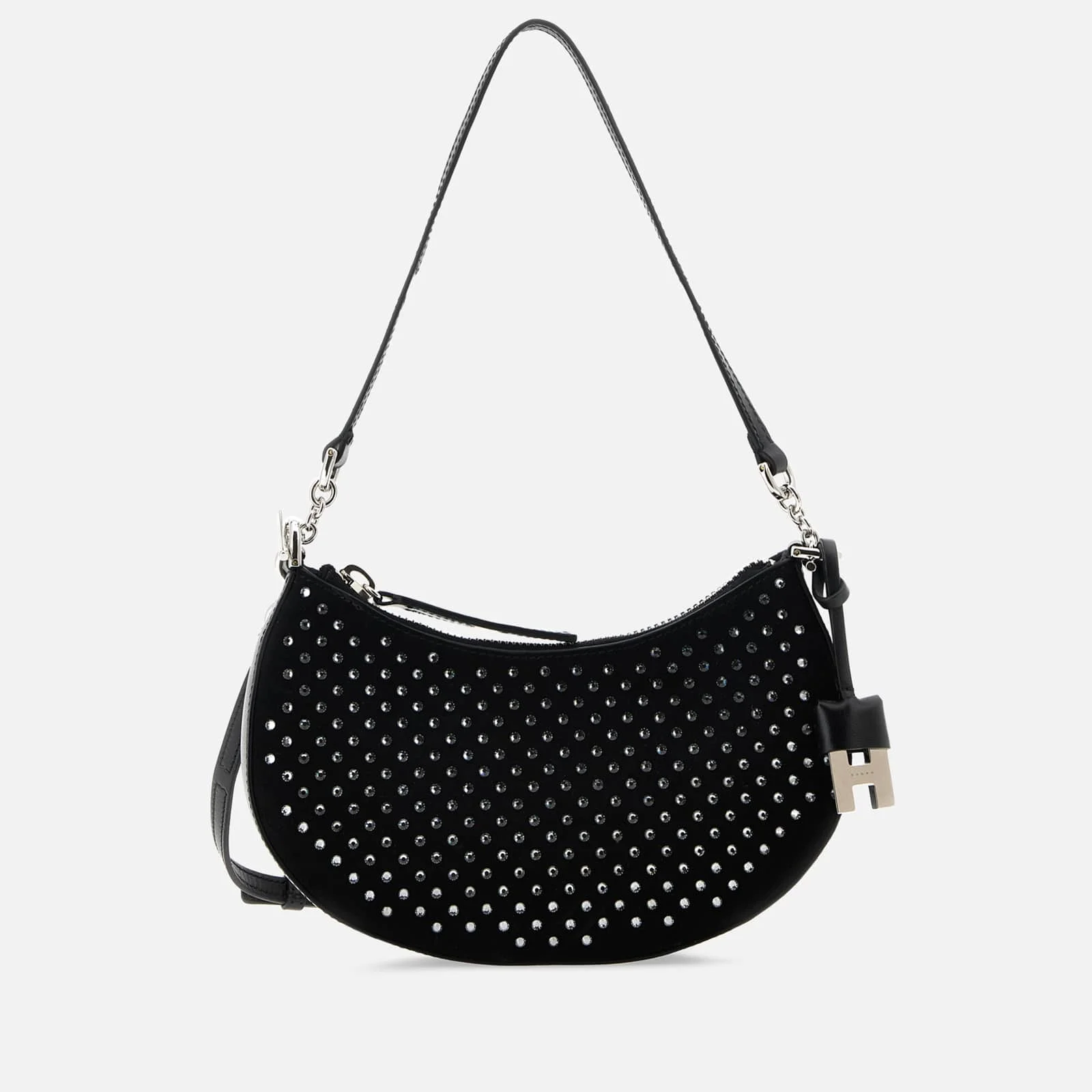 - Women's shoulder bag - Made in Italy - Item crafted in suede - Smooth leather inserts - Rhinestones on the front and back - H charm pendant - Dimensions: 9.1 x 4.7 x 1.4 ins - Interchangeable handle and shoulder strap - Zip closure - Internal pocket - Maintenance and care cards included - Fabric dustbag included A super slim curvy shaped bag, with removable shoulder strap and handle, for multiple wearing styles. Enhanced by side H charm covered in leather and T-bar detail at the handle base, it comes with all-over rhinestones and a maxi zip pull with H-stitching. A versatile creation in suede and smooth leather, with a dynamic and easy-going vibe.