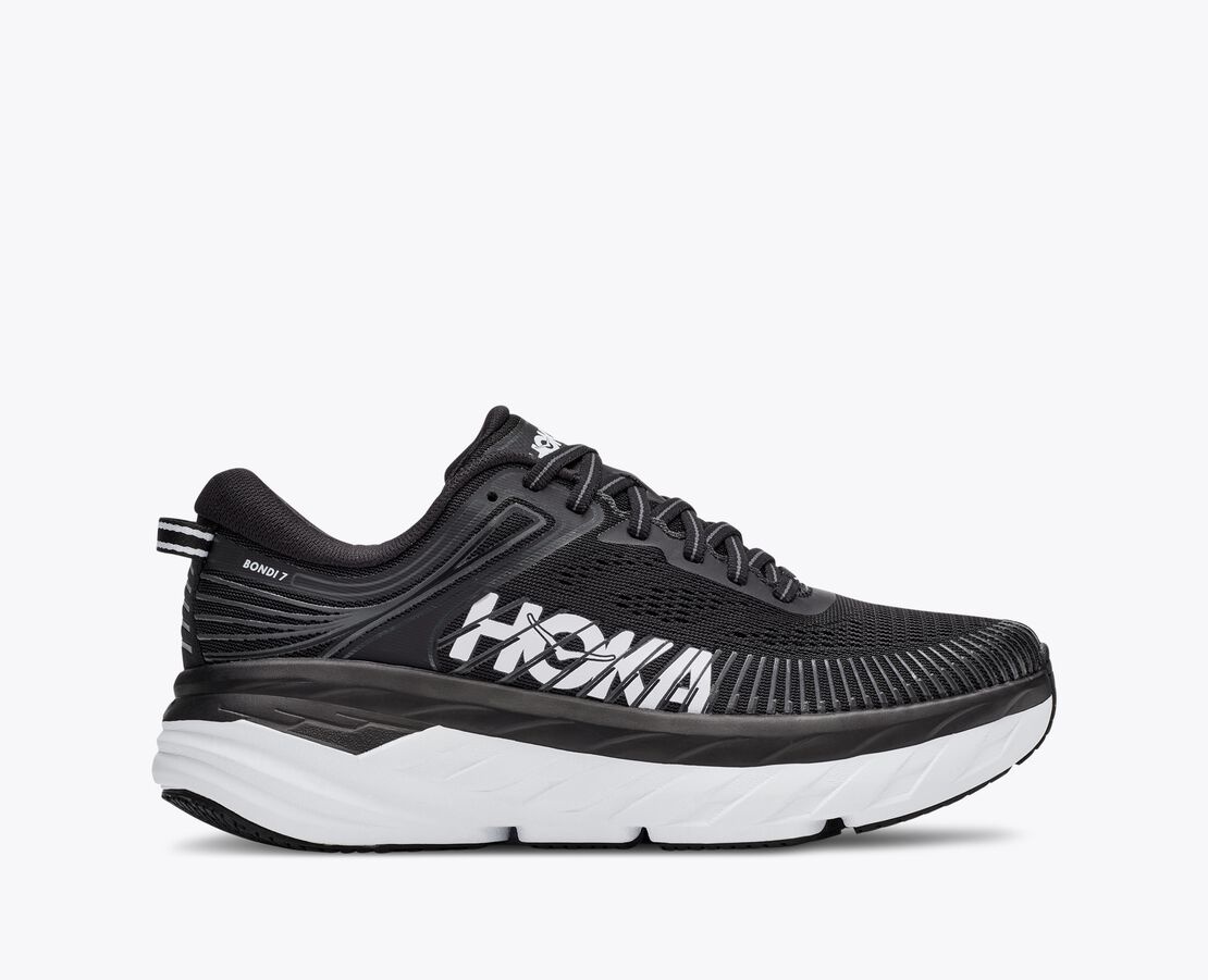 The most cushioned HOKA road shoe available, the Bondi 7 delivers a smooth and balanced ride. Engineered with the same full EVA midsole, breathable mesh upper and signature Meta-Rocker technology as its predecessor, the Bondi 7 is updated with a plush collar designed to accommodate a narrower heel - and conform to a wide variety of ankles. Item No. 1110519 Best for: Everyday Run Walking Features: Open mesh construction Memory foam collar Refined early stage Meta-Rocker Beveled heel Rubber outsole Vegan TPU overlay Full-length EVA midsole WHAT'S NEW Plusher collar to accommodate any ankle. THE DETAILS Weight 8.90 oz Heel-To-Toe Drop 4.00 mm Stability The Bondi 7 features a symmetrical bed of cushion without additional prescriptive technologies. Designed to provide the support you want and nothing you don't. Cushion The Bondi 7 features a higher bed of soft cushion, designed to provide a forgiving impact and ride.