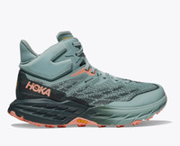 A workhorse for sloppy, wet conditions, the Speedgoat 5 Mid GTX is built with the same GORE-TEX membrane as its lower profile counterpart, along with a soft heel tab to accommodate the Achilles and flexible collar for extra ankle support. Grounded in Vibram® Megagrip with Traction Lug for enhanced grip on loose soil, this trail icon employs a foot-cradling heel bolster, rubber toe cap, and gusseted tongue to keep trail debris at bay. Item No. 1127919 Best for: Trail Running Hiking Features: Lay-flat gusseted tongue construction 44% recycled polyester Double-layer jacquard engineered mesh GORE-TEX footwear fabric with 71% recycled polyester face fabric Waterproof membrane bootie construction Rubber toe cap Compression molded EVA midsole Vibram® Megagrip with Traction Lug Bolstered heel collar construction Late stage MetaRocker™ Molded EVA sockliner 5mm lugs Vegan Laces with 70% recycled nylon and 30% recycled polyester (excluding aglet) RN 88276 WHAT'S NEW The same waterproof versatility of the Speedgoat 5 GTX, just reinforced with a supportive heel collar. THE DETAILS Weight 10.30 oz Heel-To-Toe Drop 4.00 mm Stability The Speedgoat 5 Mid GTX features a symmetrical bed of cushion without additional prescriptive technologies. Designed to provide the support you want and nothing you don't. Cushion The Speedgoat 5 Mid GTX is designed to provide protective cushion while maintaining a responsive toe-off for when you want to go faster.