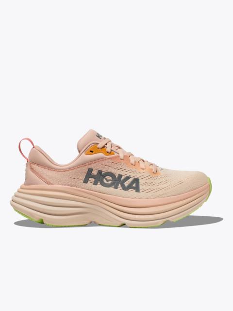 The ultra-cushioned game-changer. One of the hardest working shoes in the HOKA lineup, the Bondi takes a bold step forward this season reworked with softer, lighter foams and a brand-new extended heel geometry. Taking on a billowed effect, the rear crash pad affords an incredibly soft and balanced ride from heel strike to forefoot transaction. Item No. 1127952 Best for: Everyday Run Walking Comfort Features: Engineered mesh construction Recycled content lining mesh Ortholite ® hybrid sockliner Lightweight, resilient foam Zonal rubber placement for weight savings Vegan Partially gusseted tongue Heel pull tab Durabrasion rubber outsole WHAT'S NEW Amplifying core performance features, the Bondi 8 is upgraded with an extended heel, brand-new foam, and pillowed tongue. THE DETAILS Weight 8.90 oz Heel-To-Toe Drop 4.00 mm Volume 663.00 cm 3 Spring Measurement 34x23 mm Stability The Bondi 8 features a symmetrical bed of cushion without additional prescriptive technologies. Designed to provide the support you want and nothing you don't. Cushion The Bondi 8 features a higher bed of soft cushion, designed to provide a forgiving impact and ride.
