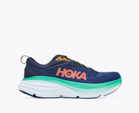The ultra-cushioned game-changer. One of the hardest working shoes in the HOKA lineup, the Bondi takes a bold step forward this season reworked with softer, lighter foams and a brand-new extended heel geometry. Taking on a billowed effect, the rear crash pad affords an incredibly soft and balanced ride from heel strike to forefoot transaction. Item No. 1127952 Best for: Everyday Run Walking Comfort Features: Engineered mesh construction Recycled content lining mesh Ortholite ® hybrid sockliner Lightweight, resilient foam Zonal rubber placement for weight savings Vegan Partially gusseted tongue Heel pull tab Durabrasion rubber outsole WHAT'S NEW Amplifying core performance features, the Bondi 8 is upgraded with an extended heel, brand-new foam, and pillowed tongue. THE DETAILS Weight 8.90 oz Heel-To-Toe Drop 4.00 mm Volume 663.00 cm 3 Spring Measurement 34x23 mm Stability The Bondi 8 features a symmetrical bed of cushion without additional prescriptive technologies. Designed to provide the support you want and nothing you don't. Cushion The Bondi 8 features a higher bed of soft cushion, designed to provide a forgiving impact and ride.