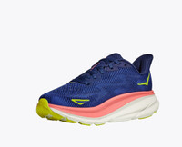 The ninth iteration of our award-winning Clifton franchise has launched, lighter and more cushioned than ever before. Eliminating weight while adding 3mm in stack height, the new Clifton 9 delivers a revitalized underfoot experience with a responsive new foam and improved outsole design. Removing overlays and hotmelts, the stripped back upper has been consciously crafted with a plusher heel, reflective heel panel, and streamlined tongue with single side medial gusset. Item No. 1127896 Best for: Everyday Run Walking Features: Breathable engineered knit upper Gusseted tongue Laces with 70% recycled nylon and 30% recycled polyester (excluding aglet) Compression molded EVA foam midsole Early stage MetaRocker™ Inherently stable geometry Durabrasion rubber outsole Vegan 35% Recycled polyester upper mesh 60% Recycled polyester collar and tongue lining 87% Recycled polyester strobel board 100% recycled polyester sockliner top cloth RN 88276 WHAT'S NEW More stack height, less weight (4 grams, to be exact). THE DETAILS Weight 7.30 oz Heel-To-Toe Drop 5.00 mm Stability The Clifton 9 features a symmetrical bed of cushion without additional prescriptive technologies. Designed to provide the support you want and nothing you don't. Cushion The Clifton 9 is designed to provide protective cushion while maintaining a responsive toe-off for when you want to go faster.