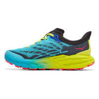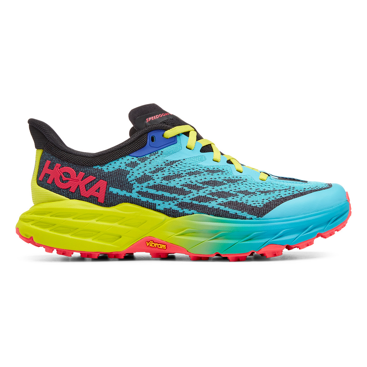 A workhorse designed for technical trails, the Speedgoat returns with less weight and more traction than ever before. A new shoe from outsole to laces, this trail beast is updated with Vibram® Megagrip with Traction Lug for enhanced grip on loose soil. Retaining the same stack height and rocker profile, the Speedgoat 5 employs a lighter midsole compound and heartier, double layer jacquard mesh to inspire confidence on any terrain. Item No. 1123158 Best for: Trail Running Hiking Features: Double layer jacquard engineered mesh Protective toe rand Late stage Meta-Rocker Vibram Megagrip with Traction Lug Vegan Lay-flat gusseted tongue Bolstered heel collar Molded EVA sockliner Compression-molded foam midsole 5mm lug RN 88276 WHAT'S NEW Less weight and more traction. (A half ounce lighter, to be exact.) THE DETAILS Weight 8.50 oz Heel-To-Toe Drop 4.00 mm Volume 519.00 cm 3 Spring Measurement 32x19 mm Stability The Speedgoat 5 features a symmetrical bed of cushion without additional prescriptive technologies. Designed to provide the support you want and nothing you don't. Cushion The Speedgoat 5 is designed to provide protective cushion while maintaining a responsive toe-off for when you want to go faster.