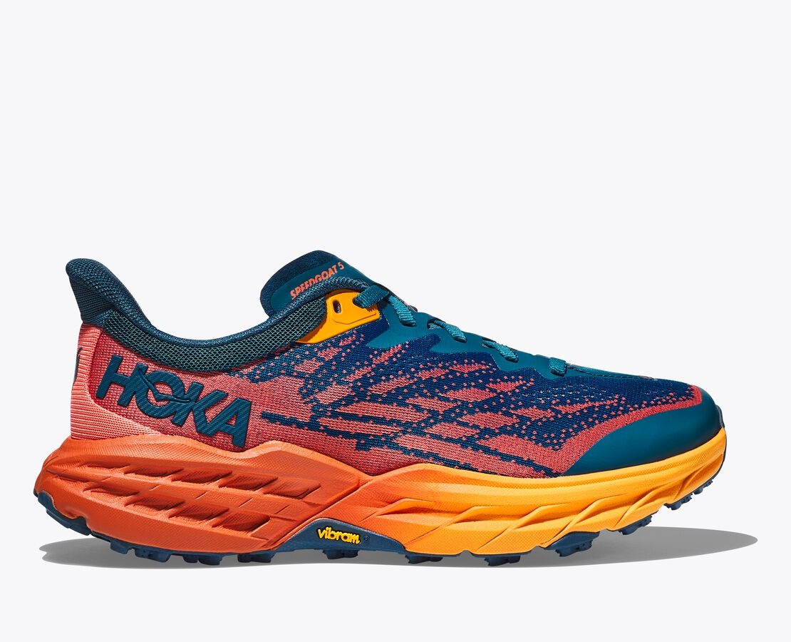 A workhorse designed for technical trails, the Speedgoat returns with less weight and more traction than ever before. A new shoe from outsole to laces, this trail beast is updated with Vibram® Megagrip with Traction Lug for enhanced grip on loose soil. Retaining the same stack height and rocker profile, the Speedgoat 5 employs a lighter midsole compound and heartier, double layer jacquard mesh to inspire confidence on any terrain. Item No. 1123158 Best for: Trail Running Hiking Features: Double layer jacquard engineered mesh Protective toe rand Late stage Meta-Rocker Vibram Megagrip with Traction Lug Vegan Lay-flat gusseted tongue Bolstered heel collar Molded EVA sockliner Compression-molded foam midsole 5mm lug RN 88276 WHAT'S NEW Less weight and more traction. (A half ounce lighter, to be exact.) THE DETAILS Weight 8.50 oz Heel-To-Toe Drop 4.00 mm Volume 519.00 cm 3 Spring Measurement 32x19 mm Stability The Speedgoat 5 features a symmetrical bed of cushion without additional prescriptive technologies. Designed to provide the support you want and nothing you don't. Cushion The Speedgoat 5 is designed to provide protective cushion while maintaining a responsive toe-off for when you want to go faster.