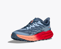 A workhorse designed for technical trails, the Speedgoat returns with less weight and more traction than ever before. A new shoe from outsole to laces, this trail beast is updated with Vibram® Megagrip with Traction Lug for enhanced grip on loose soil. Retaining the same stack height and rocker profile, the Speedgoat 5 employs a lighter midsole compound and heartier, double layer jacquard mesh to inspire confidence on any terrain. Item No. 1123158 Best for: Trail Running Hiking Features: Double layer jacquard engineered mesh Protective toe rand Late stage MetaRocker™ Vibram® Megagrip with Traction Lug Vegan Lay-flat gusseted tongue Bolstered heel collar Molded EVA sockliner Compression-molded EVA foam midsole 5mm lugs 34% recycled polyester upper mesh Laces with 70% recycled nylon and 30% recycled polyester 100% Recycled polyester sockliner top cloth RN 88276 WHAT'S NEW Less weight and more traction. (A half ounce lighter, to be exact.) THE DETAILS Weight 8.50 oz Heel-To-Toe Drop 4.00 mm Stability The Speedgoat 5 features a symmetrical bed of cushion without additional prescriptive technologies. Designed to provide the support you want and nothing you don't. Cushion The Speedgoat 5 is designed to provide protective cushion while maintaining a responsive toe-off for when you want to go faster.