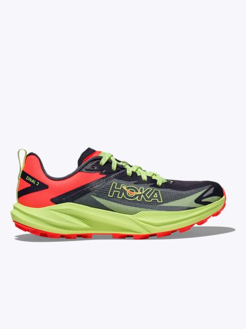 When fast trails require fancy footwork, the Zinal 3 is refreshed and ready to rip. Recrafted with an SCF midsole for a boost in energy return and a revised 5mm lug pattern that's ready to bite, it's more aggressive than ever. A svelte, extra-breathable upper with a stretchy new dynamic vamp means it doesn't skimp on comfort for those hot-on-the-trail chases, either. When you're shaving off seconds on techy terrain, the Zinal 3 is the tool for the job. Super-critically foamed EVA. Stretchy, patent-pending dynamic vamp. Lightweight leno weave. Protective toe rand. HOKA proprietary sticky rubber. Heel pull tab. Multidirectional lugs. 5mm lugs.