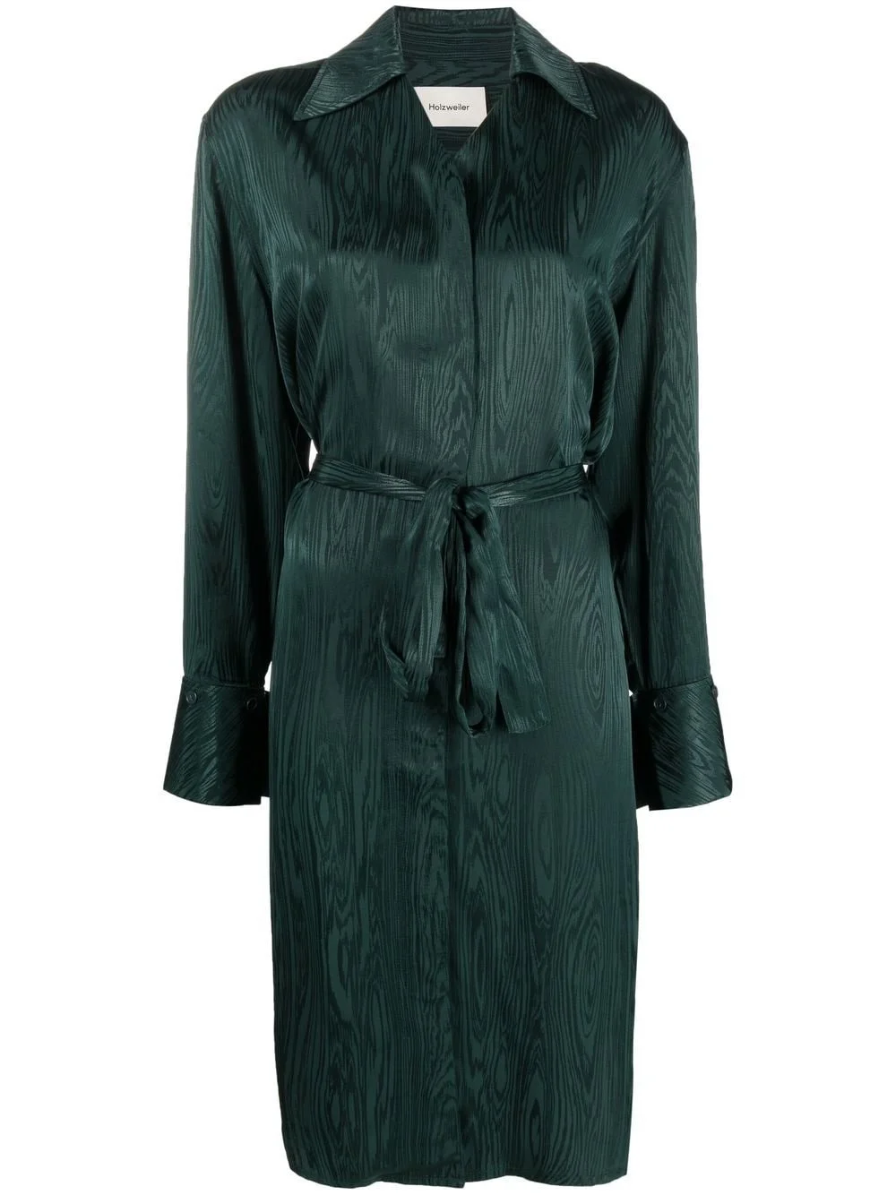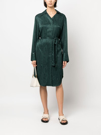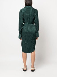 metallic-sheen shirt dress dark green satin finish classic collar concealed front fastening tied waist long sleeves mid-length Imported Composition Viscose 100% SIZE & FIT Model measurements Height 5 ft 11 in(1.8 m) Bust/Chest 31.49 in(80 cm) Hips 35.43 in(90 cm) Waist 24.4 in(62 cm) Washing instructions Machine Wash