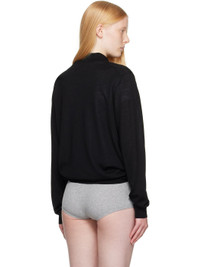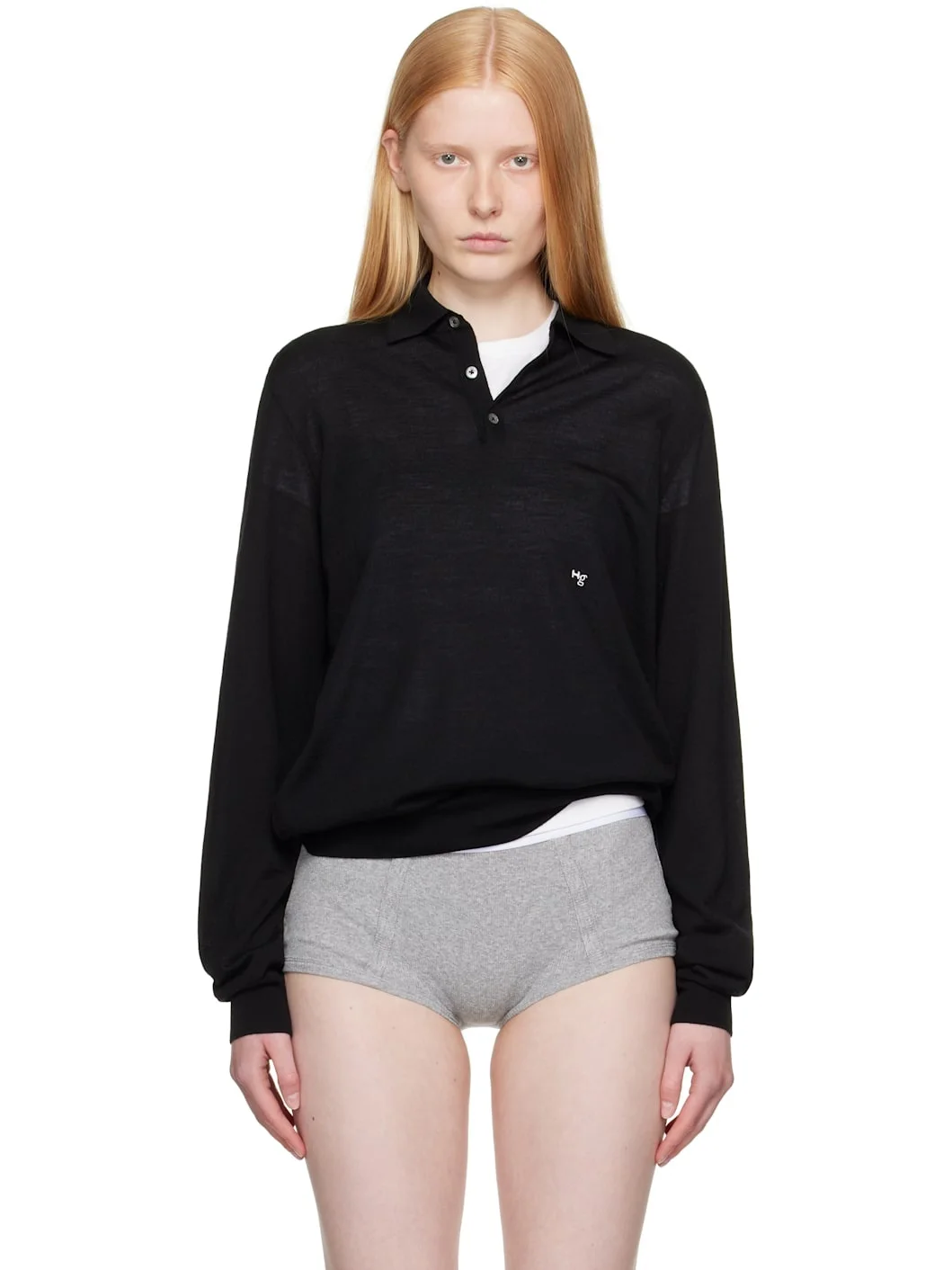 Semi-sheer knit merino wool polo. · Rib-knit spread collar, hem, and cuffs · Three-button placket · Logo embroidered at front Supplier color: Black 100% merino wool. Made in Italy 252783F108002