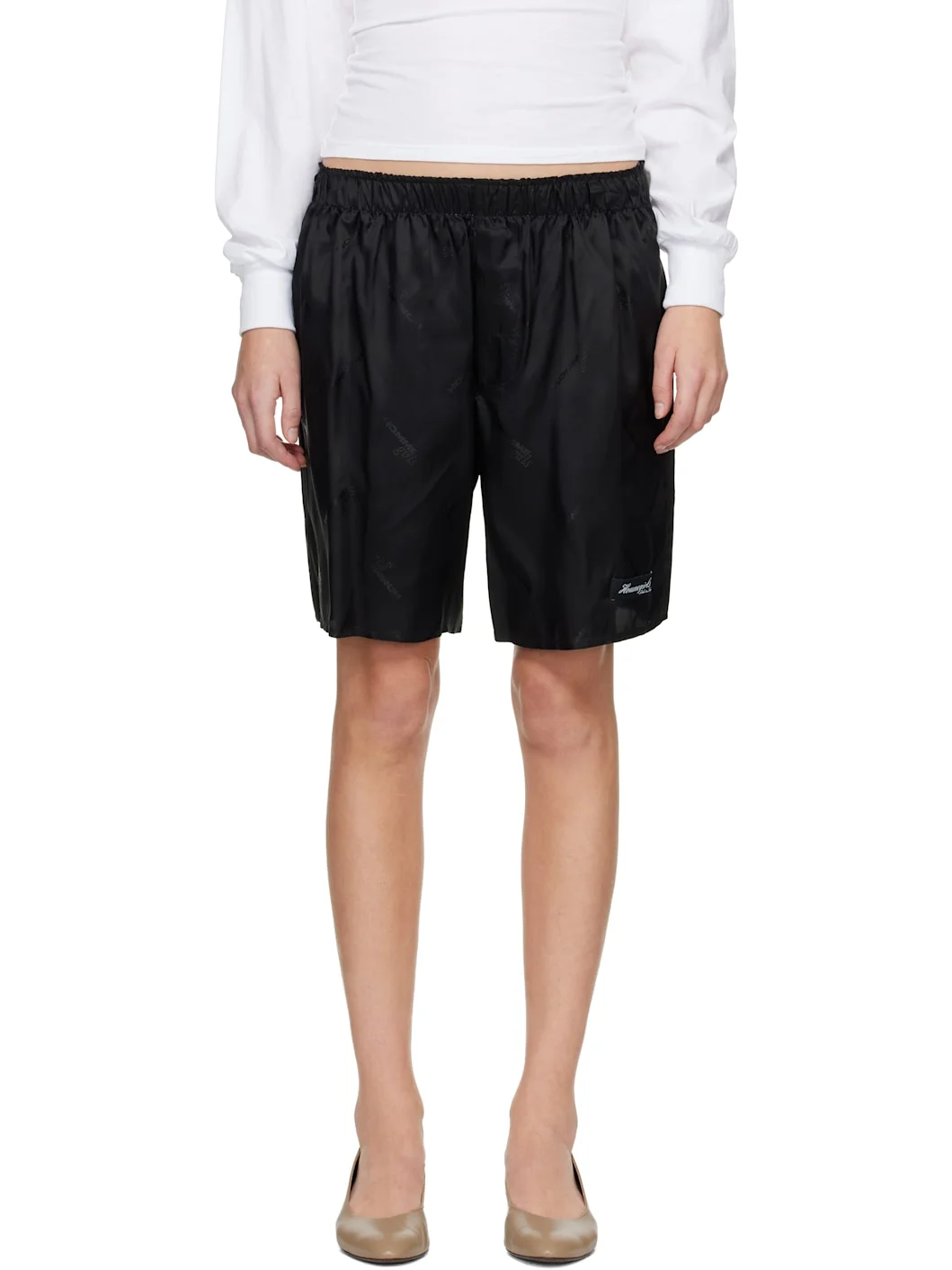 Viscose-blend satin shorts. · Jacquard logo pattern throughout · Elasticized waistband · Two-pocket styling · Button fly · Logo patch at front cuff Supplier color: Black logo 50% viscose, 50% acetate. Made in Italy 261783F088005