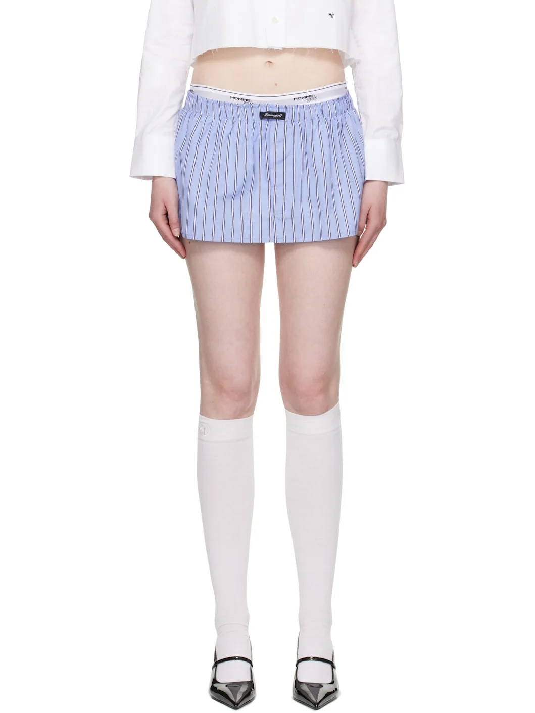 Cotton poplin miniskirt. Stripes throughout. · Alternate function as bandeau top · Logo patch at elasticized waistband · Button fly · Logo embroidered at front hem Supplier color: Japanese blue stripe 100% cotton. Made in Italy 252783F090003