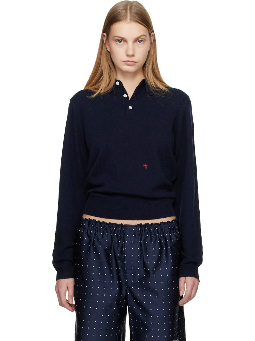 Knit wool-blend polo. · Rib-knit spread collar, hem, and cuffs · Three-button placket · Logo embroidered at front Supplier color: Navy 90% wool, 10% cashemre. Made in Tunisia 261783F108007