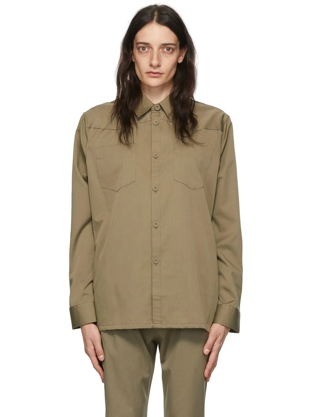 Wool-blend poplin shirt. · Spread collar · Button closure · Patch pockets · Single-button barrel cuffs · Vented side-seams · Shell hardware Supplier color: Hazelnut brown 53% wool, 47% cotton. Made in Portugal 221995F109006