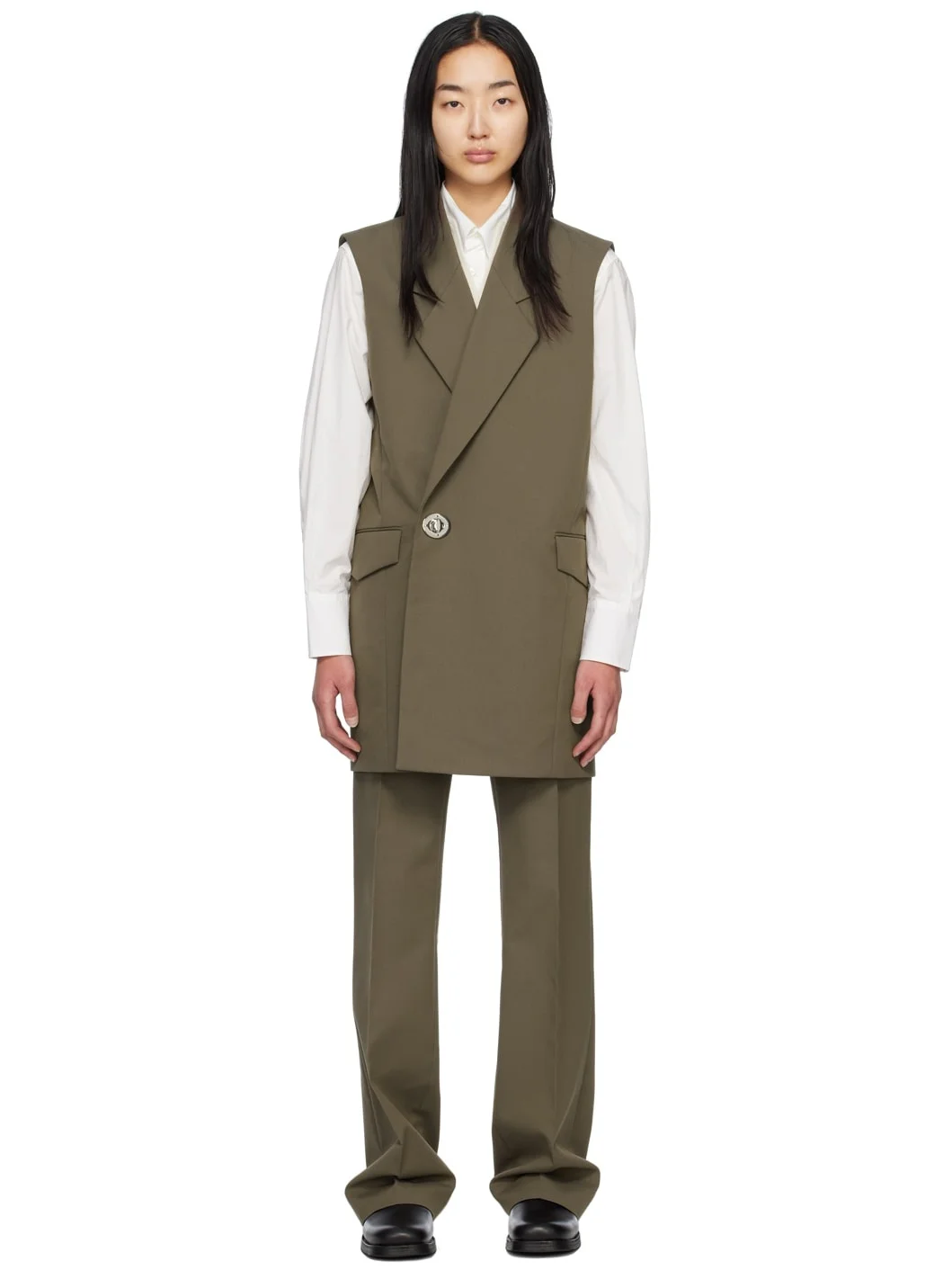Cotton- and wool-blend twill dress. · Notched lapel · Twist-lock closure · Flap pockets · Welt pocket at interior · Full satin lining Supplier color: Khaki green Body: 56% cotton, 44% wool. Lining: 100% viscose. Made in Portugal 231995F087012