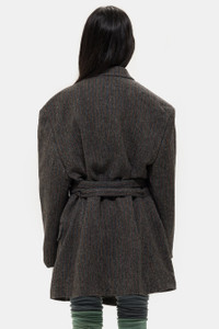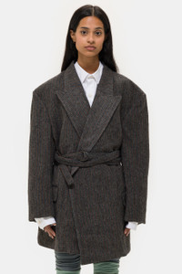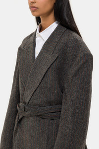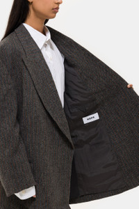 HOPE women's oversized fit herringbone striped blazer. Fit - Oversized fit - European women's sizing - We recommend your regular size for intended fit, - One size down for a more true to size fit - Model wears size 36 Feature - Oversized fit - Wide shoulder design - Wrap blazer closure - Double breasted - Peak lapel - Coroso buttons - Viscose lining - Orange stripe throughout design - Striped sleeve lining - Removable belt - 3 inside pockets Fabrication - 100% Wool SKU: 47117109-00763-40