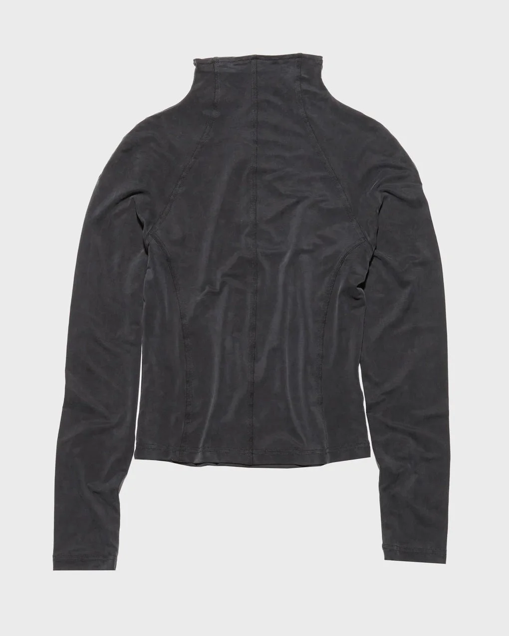 Fitted Mockneck Top from Hope. A fitted top with a mock neck. Designed with a cropped style and flatlock seams. Made from cupro jersey, it features a washed silky look with a subtle sheen. Size and Fit - Fits true to size, choose your usual size - The model is 176 cm tall and is wearing size 36 Specification - Article number - ID: 174755-523 - Brand: Hope - Color: Washed black - Washing Instructions: Machine wash - Made of: 92% cupro, 8% elastane