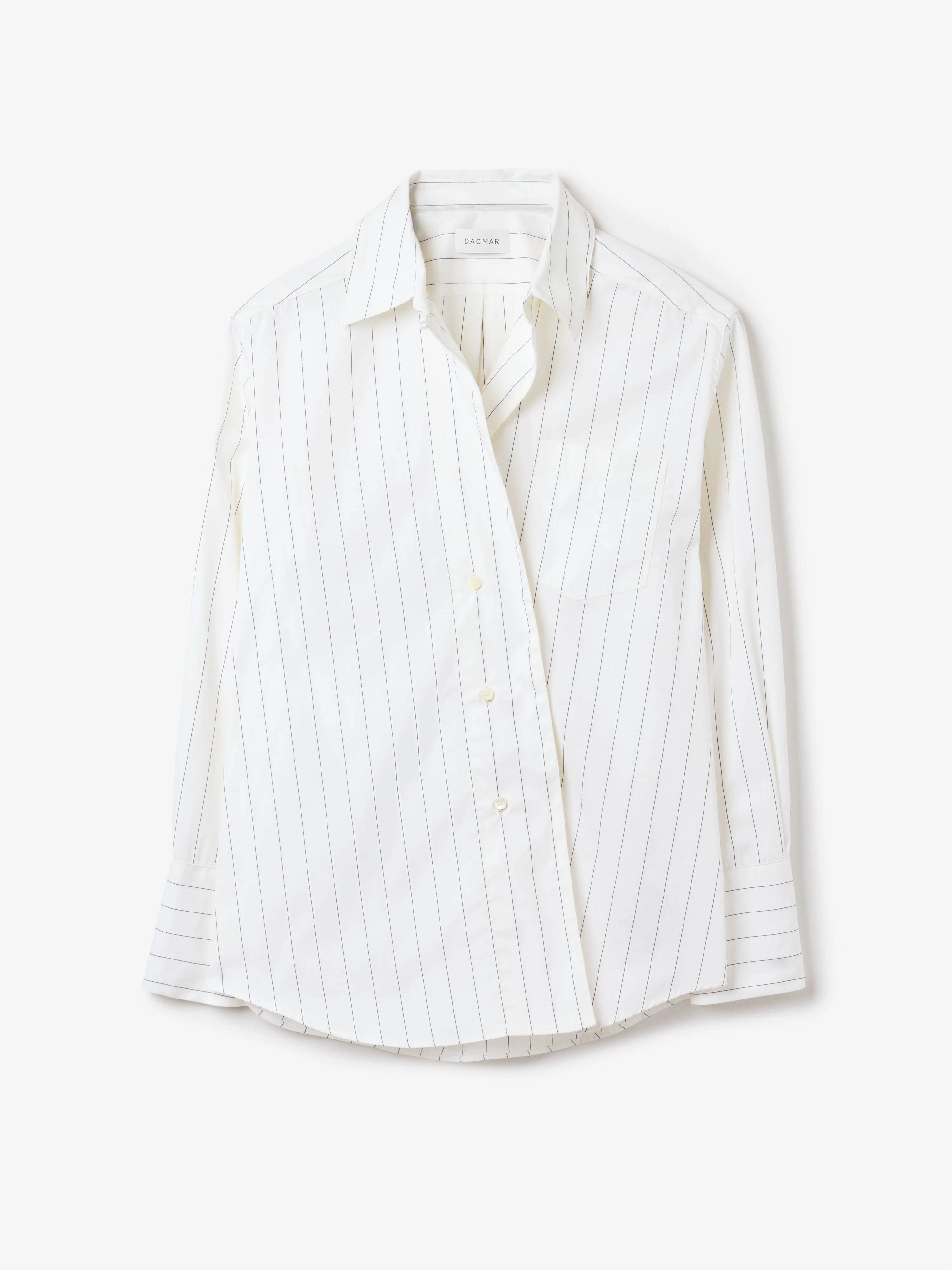 Button-up shirt in lightweight organic cotton poplin with a relaxed fit, asymmetric fold-over collar, and three-buttoned cuffs honouring Dagmar’s three founding sisters. Signature logo on the side. FIT & SIZING Model is 177 cm / 5'8" and is wearing a size 36, UK 8, US 4. MATERIAL 100% Organic cotton GARMENT CARE Machine wash 30 GARMENT ORIGIN Produced in Portugal