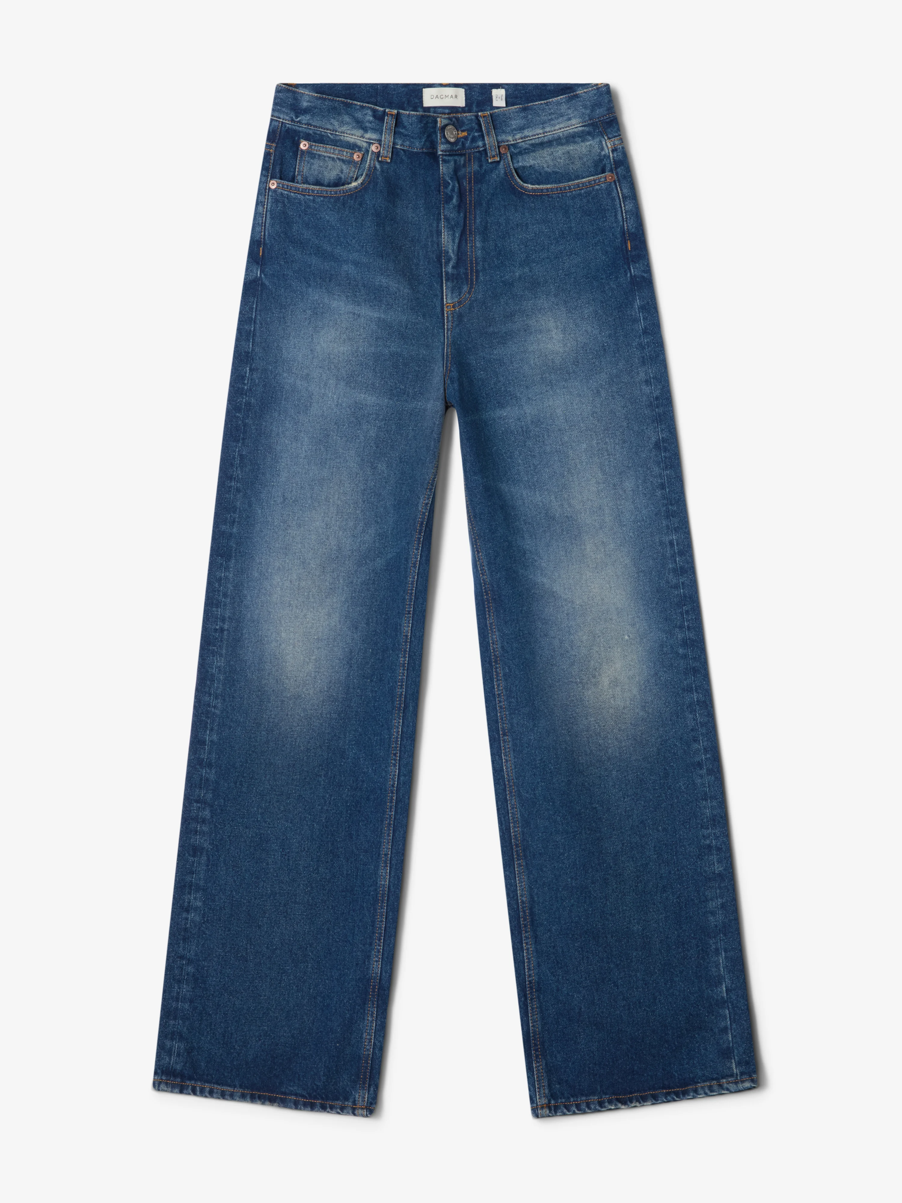 A mid-rise long-length denim in 100% organic cotton, jeans with a baggy fit, wide leg, slightly dropped drotch and classic 5-pocket frame. Made in Italy. - Baggy fit - Mid waist - Wide leg - Slightly dropped crotch - Long Length - Zip fly FIT & SIZING Model is 178 cm/ 5'8" and is wearing a size 27/34 Fits big in size, many choose to size down one size MATERIAL 100% Organic cotton GARMENT CARE Machine wash 30° delicate GARMENT ORIGIN Produced in Italy