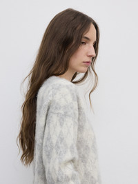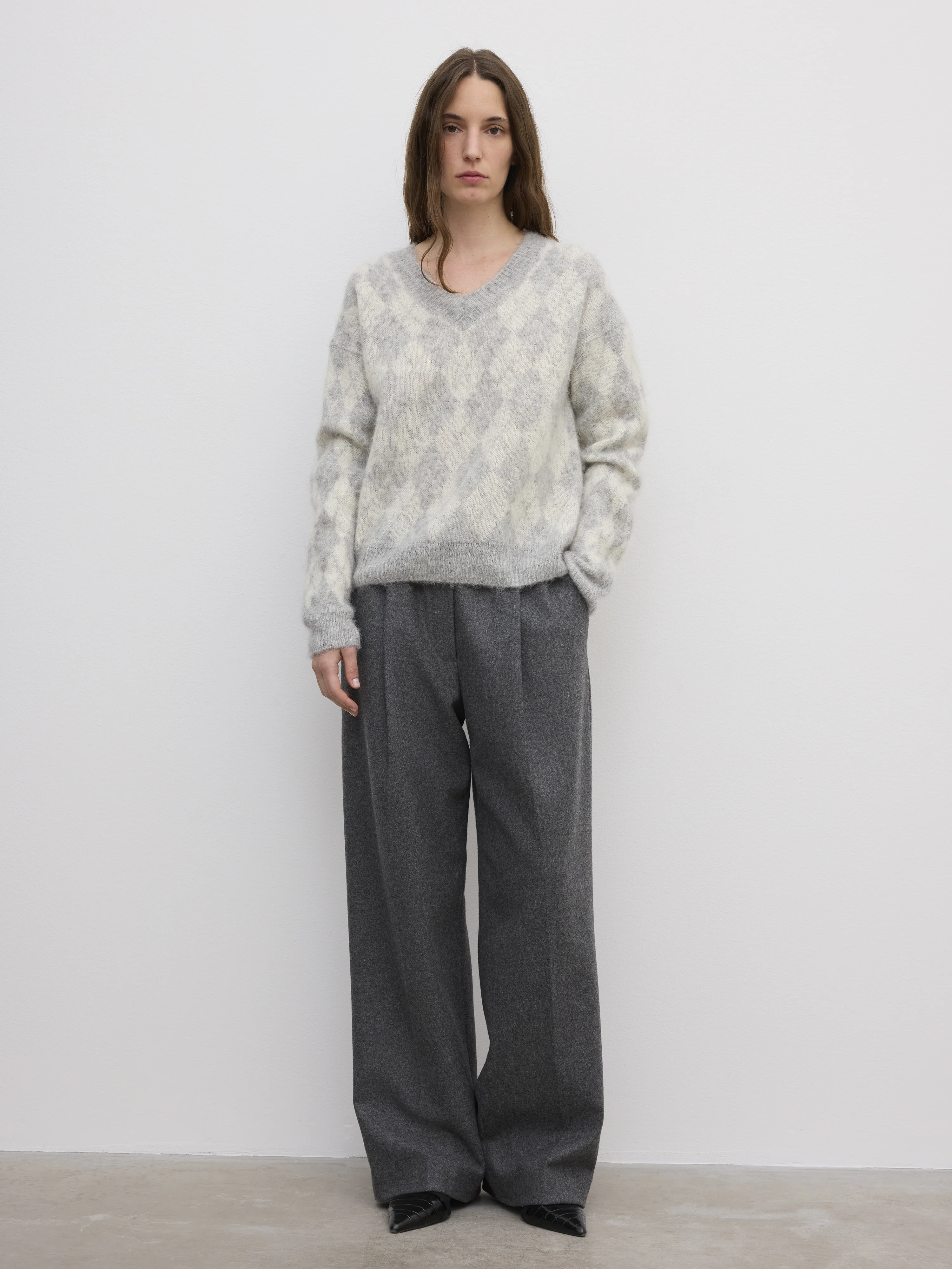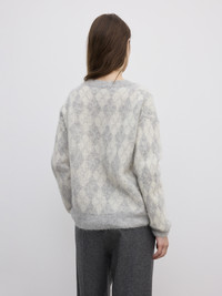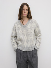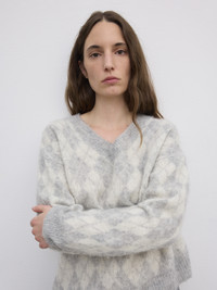 V-neck sweater in light and silky, brushed Italian alpaca. Animated by an argyle pattern, with a relaxed fit, extended sleeves, and dropped shoulders, finished by inverted seams. FIT & SIZING Model is 177 cm / 5'8" and is wearing a size 36, UK 8, US 4. MATERIAL 40% Baby Alpaca 25% Extrafine wool, 35% Polyamide GARMENT CARE Handwash cold GARMENT ORIGIN Produced in Sweden