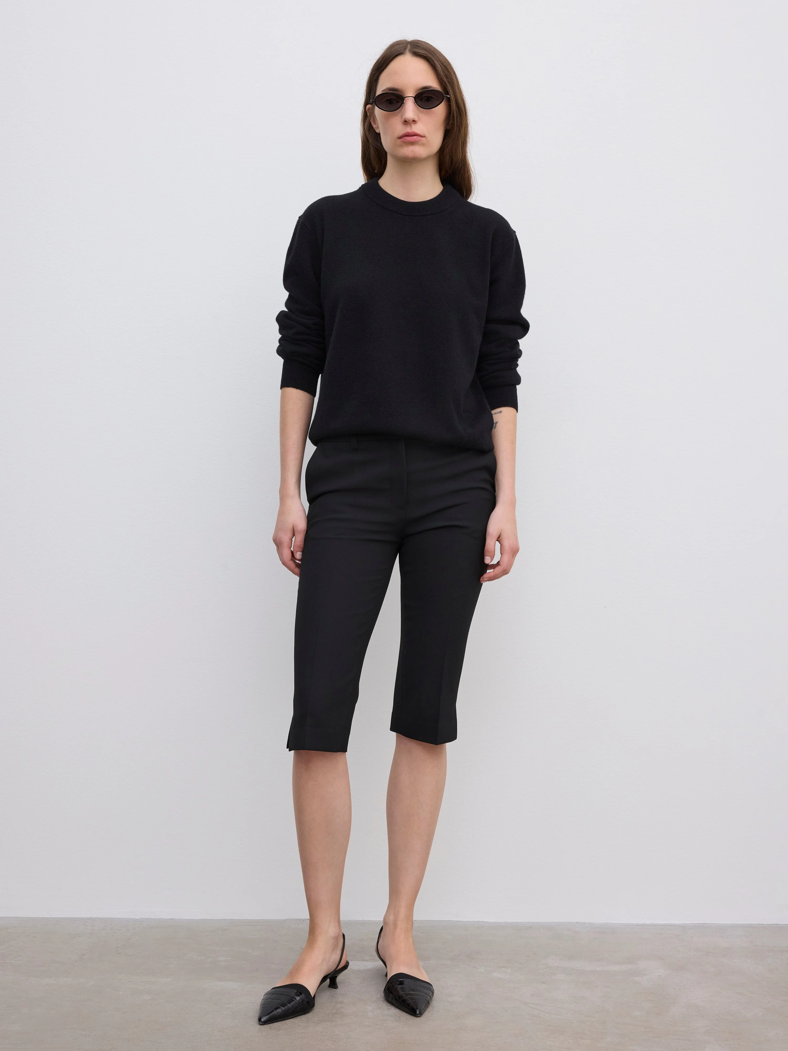 Tailored mid-rise capri trousers in lightweight suiting with narrow leg, pressed creases, front slash pockets, and jet pockets at the back. FIT & SIZING Model is 177 cm / 5'8" and is wearing a size 36, UK 8, US 4. MATERIAL 63% Polyester 27% Viscose 7% Cotton 3% Elastane GARMENT ORIGIN Produced in Portugal
