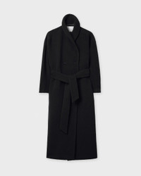 Coat relaxed wool from Dagmar. A warming, double-breasted full-length wool coat featuring a soft cocoon silhouette, dropped shoulders, rounded sleeves, and a shawl collar. Finished with hidden side pockets, a removable belt, and hand-stitched detailing. Fully lined. Size and Fit - Fits true to size, choose your usual size - The model is 175 cm tall and is wearing size S Specification - Article number - ID: 177045-000 - Brand: Dagmar - Color: Black - Washing Instructions: Dry Clean - Made of: 70% Wool 20% Polyester 5% Polyamide 5% Other fibre