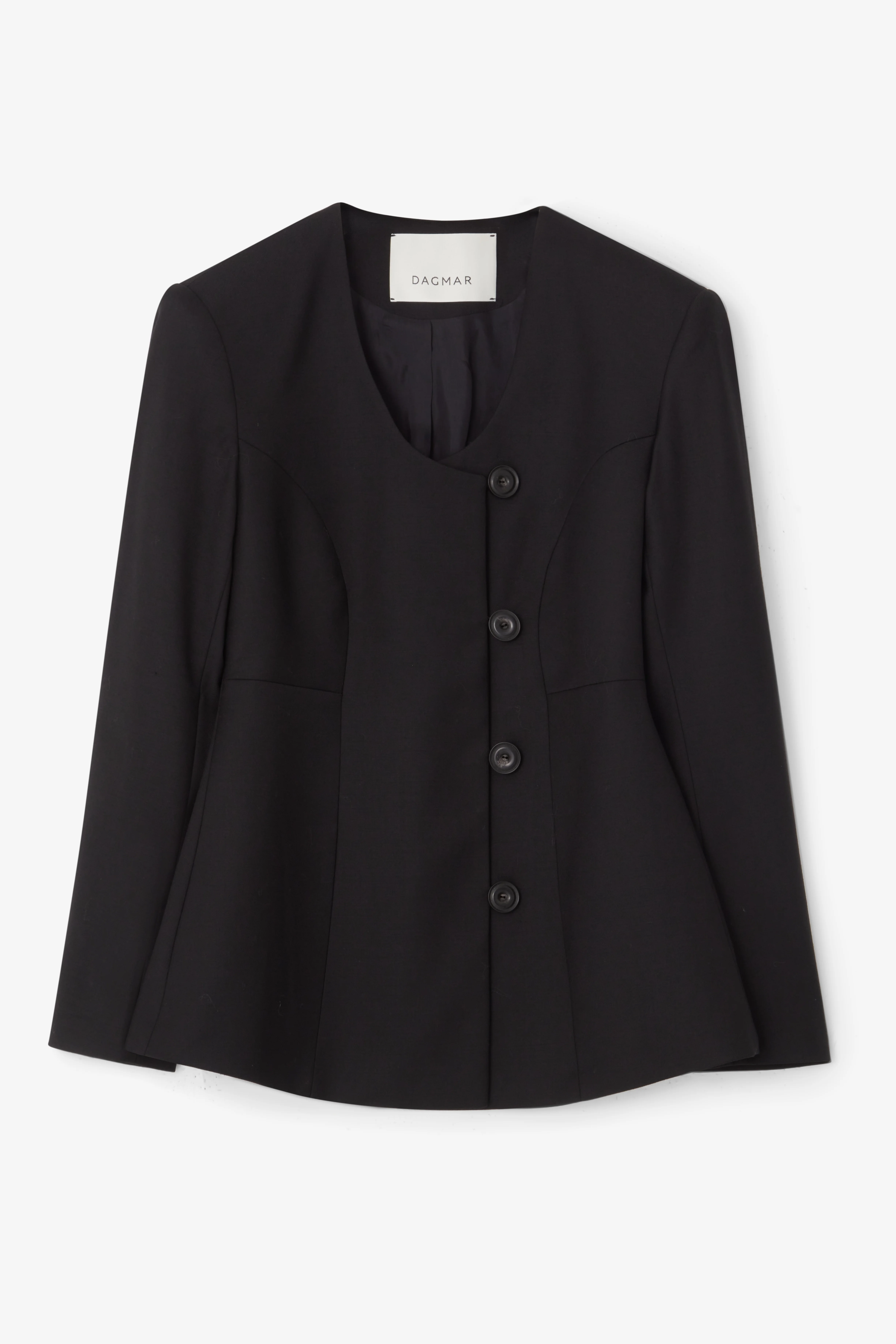 Collarless blazer made from a wool blend with a fitted frame, rounded neckline and softly tailored shoulders. Fully lined. FIT & SIZING Dry clean only MATERIAL 54% Recycled polyester 44% Virgin wool, 2% Elastane GARMENT ORIGIN Produced in Portugal