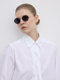 Button-up shirt in crisp organic cotton poplin with a relaxed and slightly cropped fit, asymmetric fold-over collar, and a three-button front honouring Dagmar’s three founding sisters. Signature logo on the side FIT & SIZING Model is 176 cm/ 5'7" and is wearing a size S, UK 8, US 4. MATERIAL 100% Organic cotton GARMENT ORIGIN Produced in Portugal