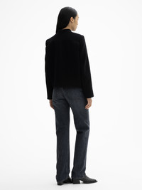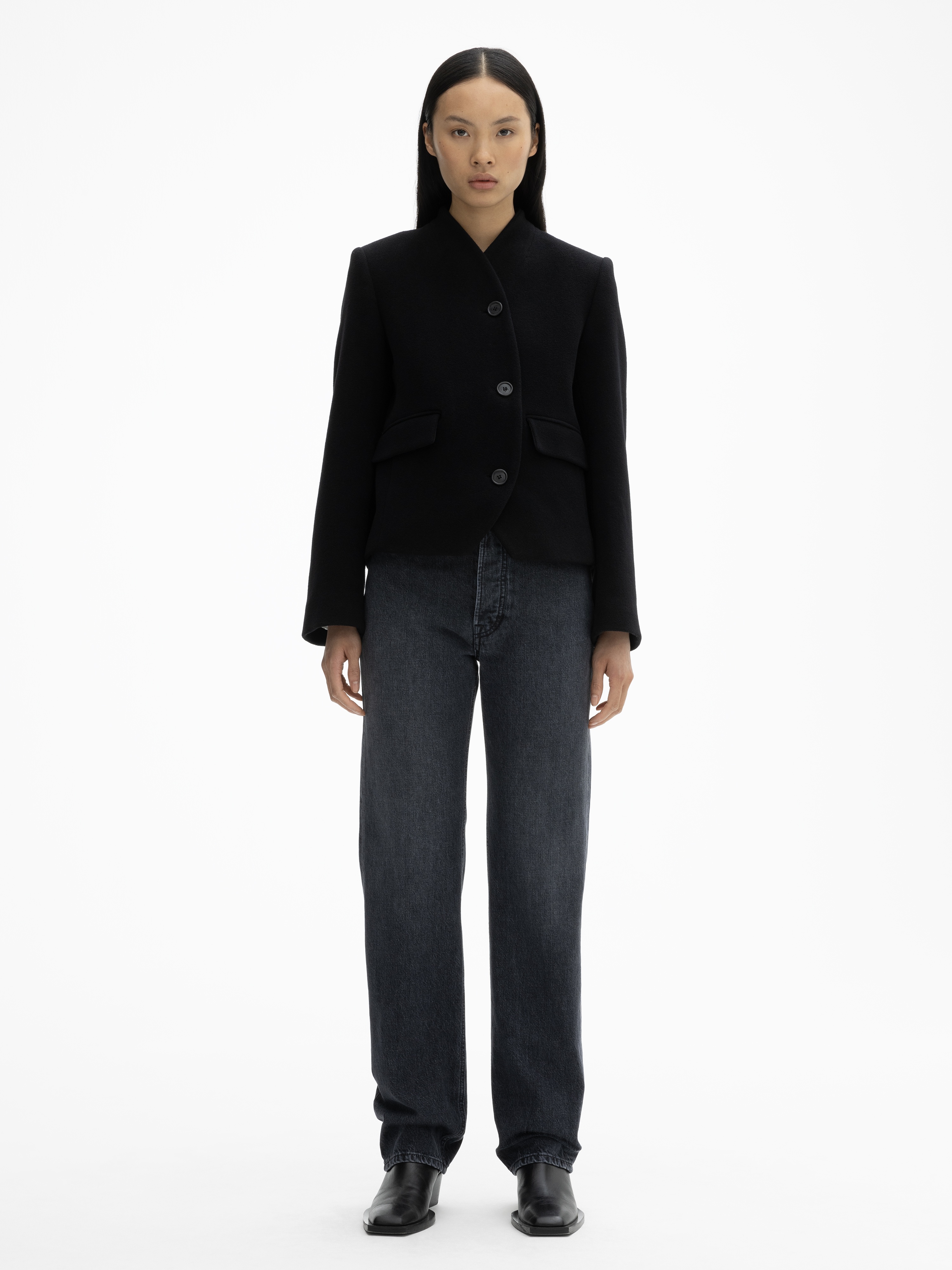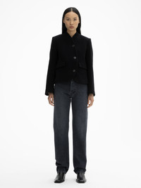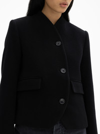 Tailored stand-collar jacket made from Italian wool with a curved front closure, flap pockets, and knife pleats at the back for a rounded look. Fully lined. FIT & SIZING Model is 175cm/ 5'7" and is wearing a size 36, UK 8, US 4. MATERIAL 65% Recycled wool, 35% Recycled polyamide. GARMENT CARE Dry clean only. GARMENT ORIGIN Produced in Portugal