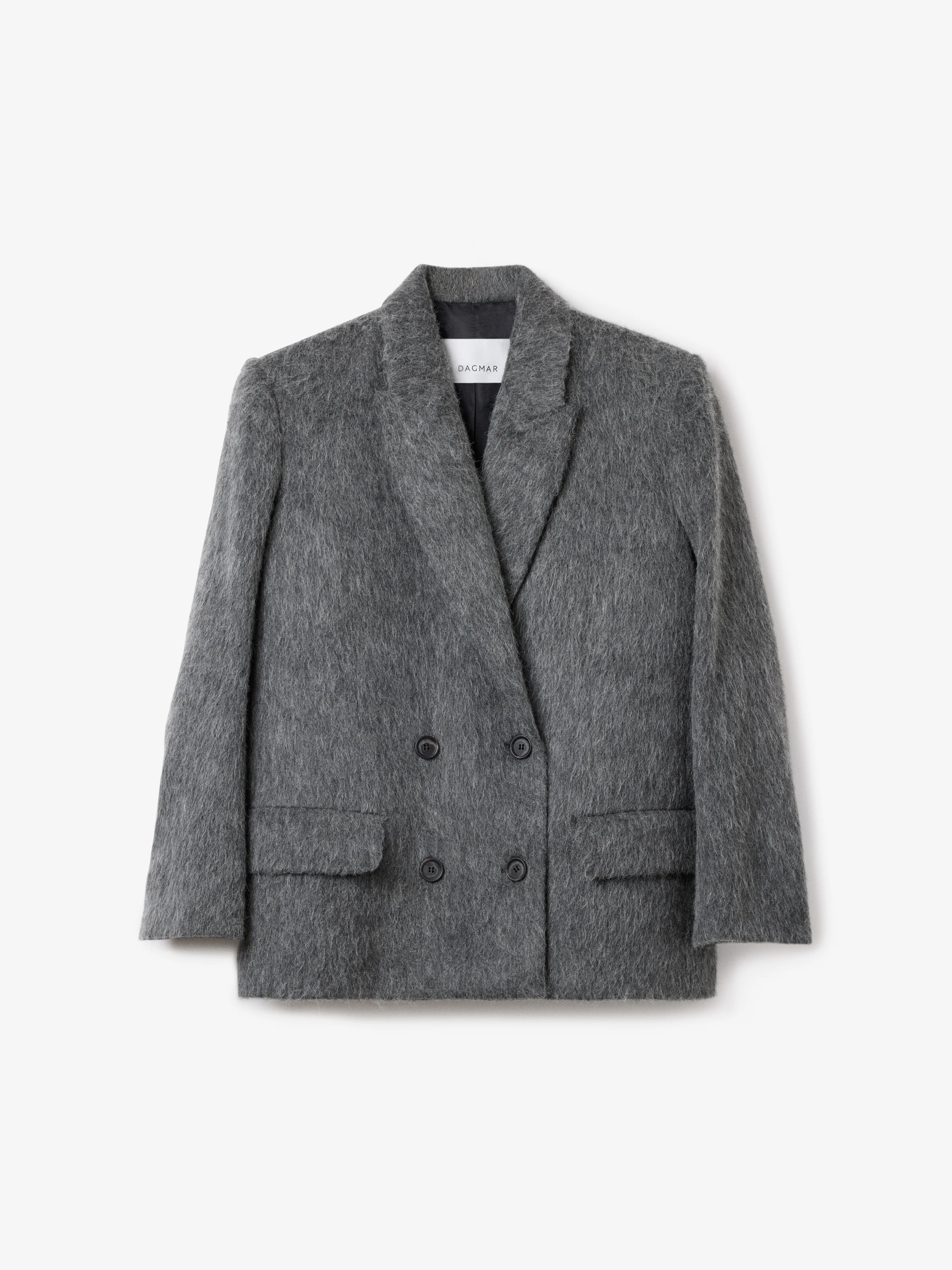 Double-breasted jacket with a relaxed, tailored frame made from brushed, lush and lofty Italian wool. Complete with peak lapels, bespoke Dagmar buttons, and front flap pockets. Fully lined. FIT & SIZING Model is 175cm/ 5'7" and is wearing a size 36, UK 8, US 4. MATERIAL 78% Wool20% Polyamide1% Elastane 1% Other GARMENT CARE Dry clean GARMENT ORIGIN Produced in Portugal