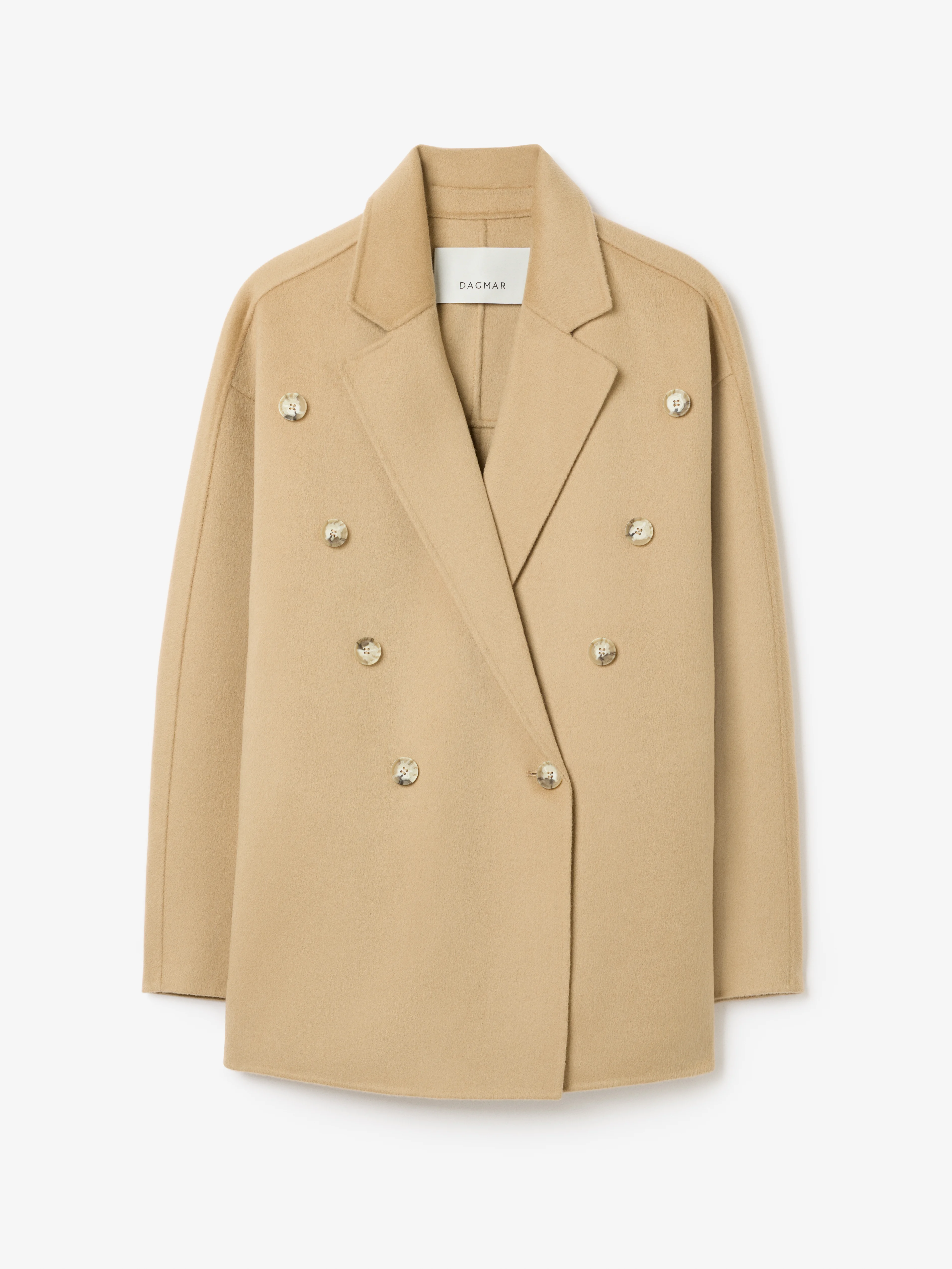 A hand-stitched double-breasted jacket in luxurious wool double with an elongated, rounded silhouette. Characterised by dropped shoulders, notched lapels, accentuating seams, and bespoke horn-button closures. Features in-seam pockets. MATERIAL 100% Wool GARMENT ORIGIN Produced in China