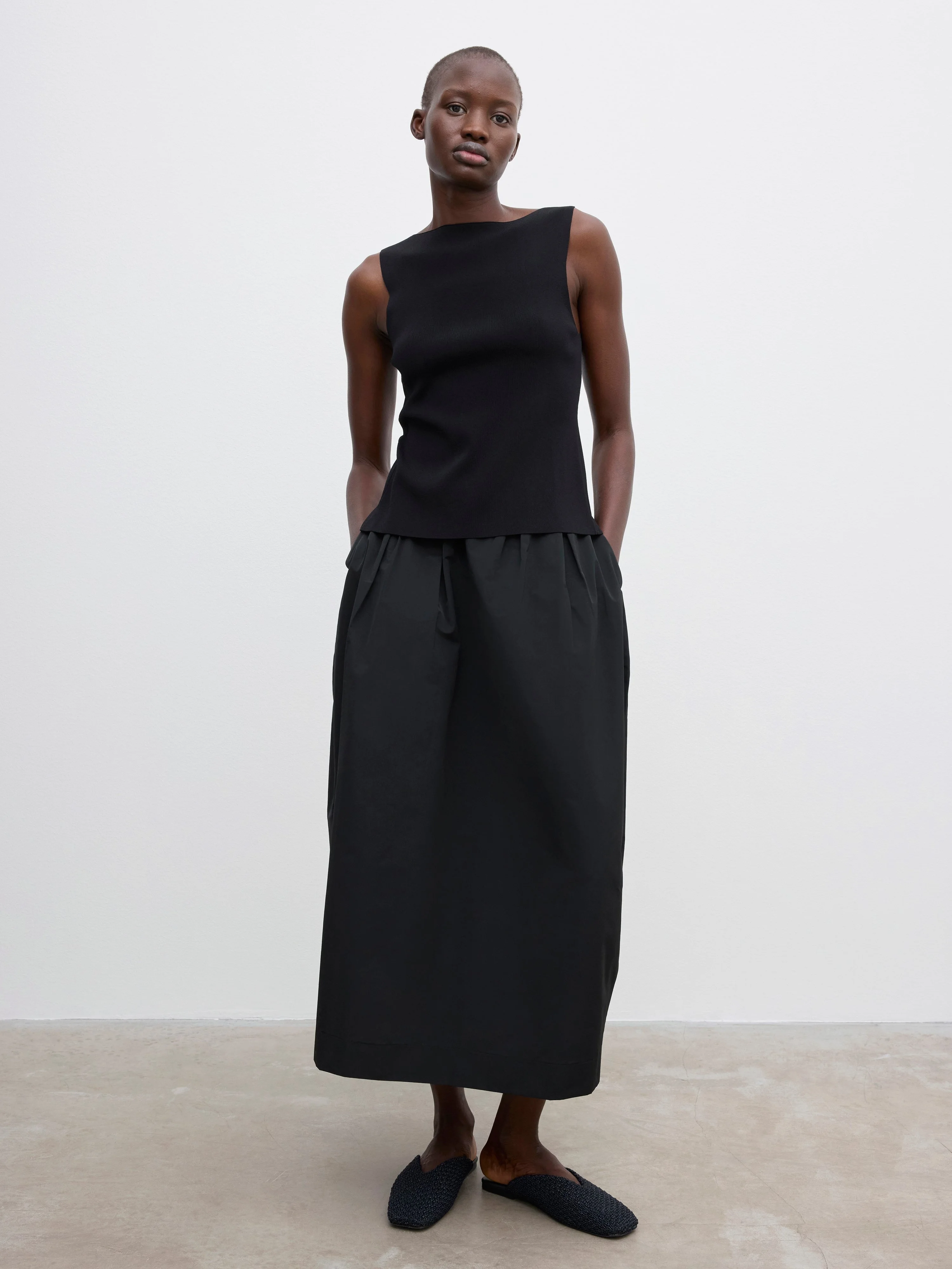 Sleeveless top in a softly structured fine-knit rayon blend with a boat neck and slim-fitting frame. Characterised by cut-out detailing and ties at the back. FIT & SIZING Model is 178cm/ 5'8" and is wearing a size 36, UK 8, US 4. MATERIAL 63% Rayon, 37% Nylon GARMENT CARE Manually handwash cold, dry flat GARMENT ORIGIN Produced in Hong Kong SAR China