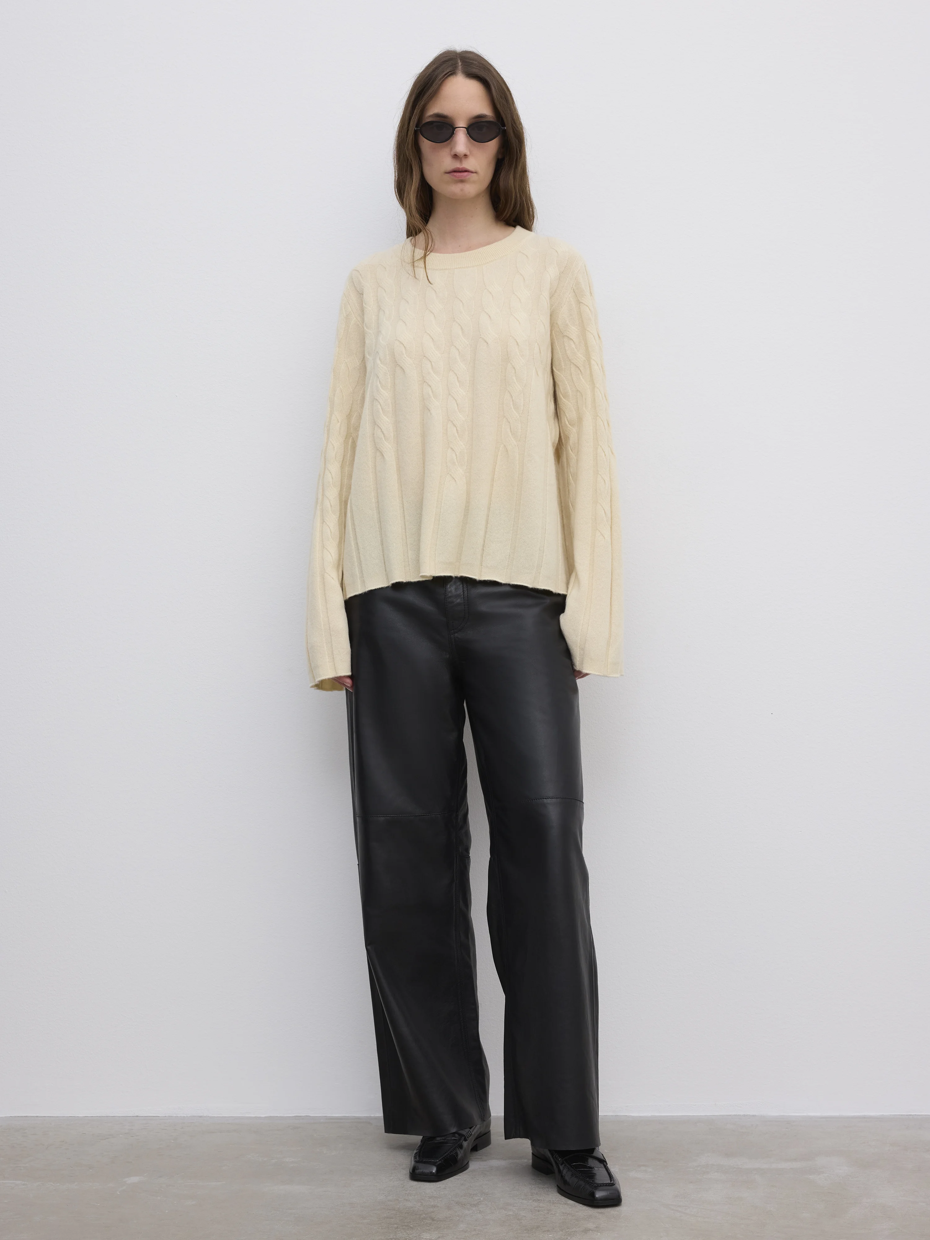 Crew neck sweater from a soft cashmere and wool blend with a relaxed frame, wide extended sleeves, and a dynamic cable knit pattern by Dagmar’s in-house knitting atelier. FIT & SIZING Model is 177 cm / 5'8" and is wearing a size 36, UK 10, US 6. MATERIAL 70% Wool 30% Cashmere GARMENT CARE Handwash cold GARMENT ORIGIN Produced in China