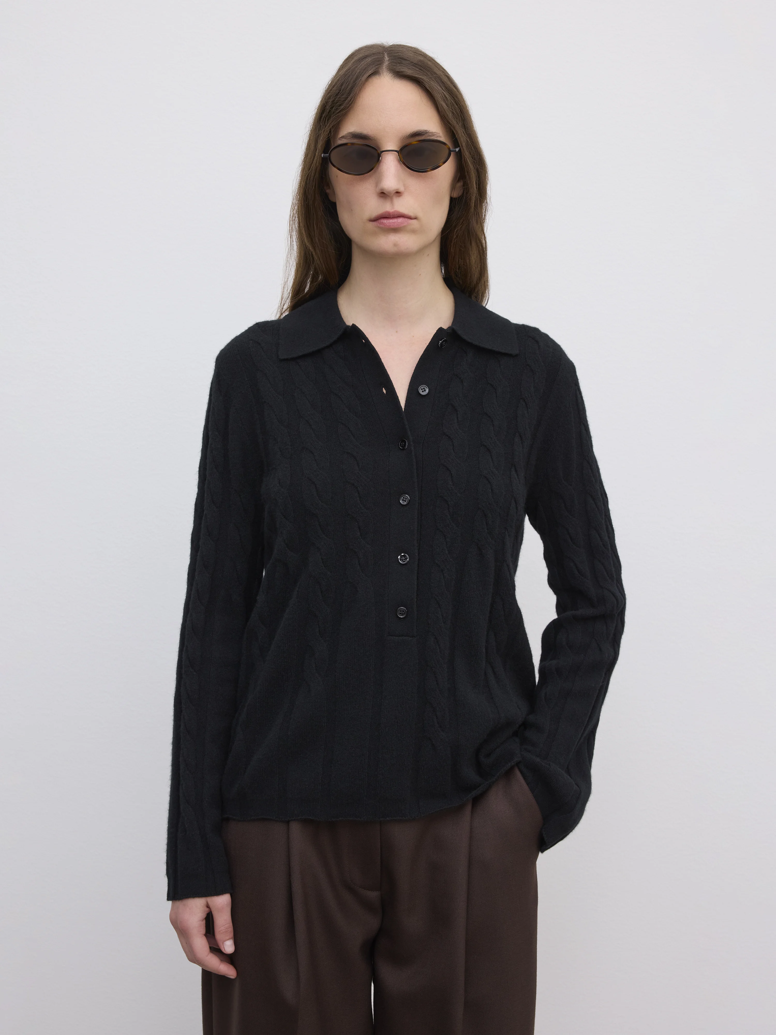 Polo sweater from a soft cashmere and wool blend with a relaxed frame and a dynamic cable knit pattern by Dagmar’s in-house knitting atelier. FIT & SIZING Model is 177 cm / 5'8" and is wearing a size 36, UK 10, US 6. MATERIAL 70% Wool, 30% Cashmere GARMENT CARE Handwash cold GARMENT ORIGIN Produced in China