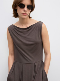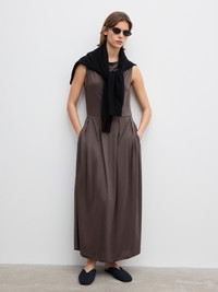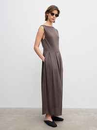 Sleeveless ankle-length dress with a soft hand feel, framed by a close-fitting top, a gently draped, high, and wide feminine neckline, and a pleated skirt. Features in-seam pockets. FIT & SIZING Model is 176 cm / 5'7" and is wearing a size 36, UK 8, US 4. MATERIAL 100% Tencel GARMENT CARE Machine wash, 30° delicate GARMENT ORIGIN Produced in Portugal